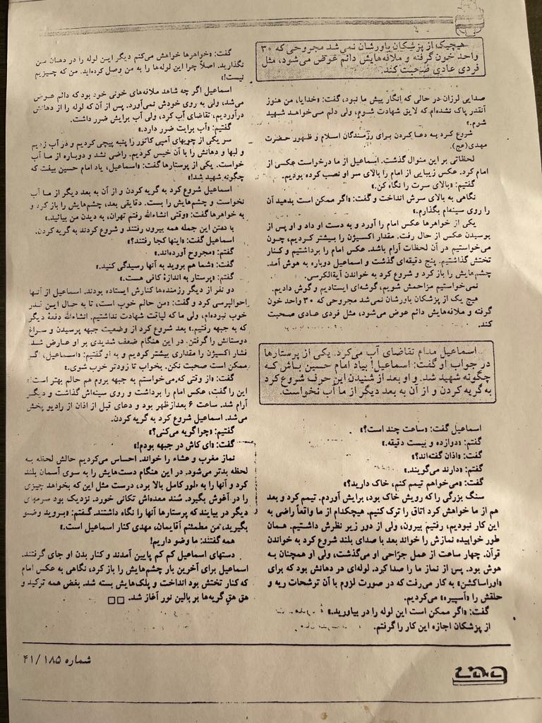 لحظاتی بر این منوال گذشت. اسماعیل از ما درخواست عکسی از امام کرد. عکسی زیبایی از امام را بالای سر او نصب کرده بودیم. گفتیم: بالای سرت را نگاه کن. نگاهی به بالای سرش انداخت و گفت: اگر ممکن است بدهید آن را روی سینه ام بگذارم. یکی از خواهر ما عکس امام را آورد و به دست او داد و او پس از بوسیدن عکس از حال رفت. مقدار اکسیژن را بیشتر کرده ایم، چون می خواستیم در آن لحظات آرام باشد. عکس امام را برداشتیم و کنار تختش گذاشتیم. پنج دقیقه ای گذشت و اسماعیل دوباره به هوش آمد. چشم هایش را باز کرد و شروع کرد به خواندن آیه الکرسی. نمی خواستیم مزاحمش شویم ، گوشه ای ایستادیم و گوش دادیم. اسماعیل مدام تقاضای آب می کرد. یکی از پرستار ها در جواب او گفت : اسماعیل ! بیاد امام حسین باش که چگونه شهید شد . و او بعد از شنیدن این حرف شروع کرد به گریه کردن و از آن به بعد دیگر از ما آب نخواست.