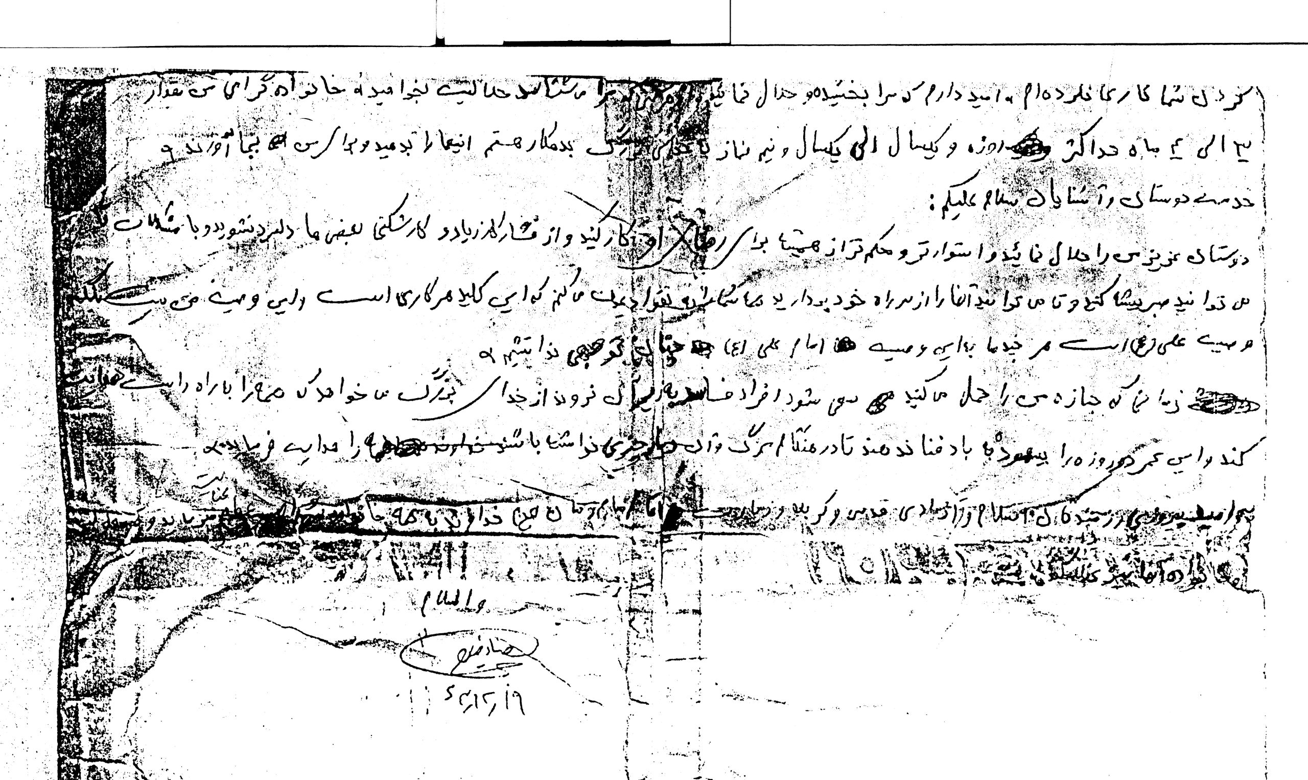 در پايان اگر بنده در راه هدف و ايمان خود طوري شدم شما، مخصوصاً پدر و مادر عزيزم هرگز براي من گريه نكنيد براي علي اكبر حسينu گريه كنيد كه واقعاً در ميدان جنگ با كفار، مظلومانه شهيد شد و كسي نبود كه لبيك بگويد ولي اين جوان هاي عزيز ما هستند كه به ياري اسلام شتافته و به رهبري خميني لبيك مي گويند و هر پرچمي كه از دست پر توان رزمنده اي مي افتد رزمنده ديگر آن را بدست مي گيرد، پس چرا بايد ناراحت شد تا وقتي همچون جوان هايي در مملكت ما هستند ناراحتي ندارد.