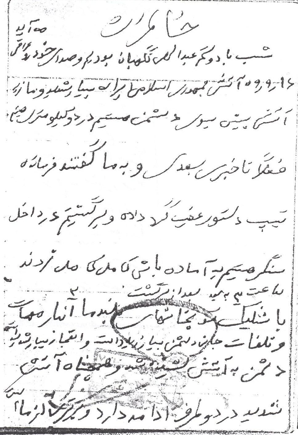 6 تانگ مهندم شد و 10 تانک به سمت و 3 مزد هوایی به قیمت و کلی مهمات همدم کردیم و همگی سعی و سالم به سنگرهای خود بازگشتیم به خداوندی خدا یک از حتی از بین ماها خون نیامد بسیار زیاد ترسو هستند آدم تا جبهه نیاد به عراق کثیف گوش می کند میگه حتما گفته های عراقی درست است و یا و بالاخره عراق به گفته خمینی هیچ غلطی نمی تواند بکند و پیروزی اذان ما و به خدمت برادرانم عباسی و رسخاره را یک به یک دعا سلام می رساندم و امید که حال شما خوب و خرم بوده باشید و به خدمت برادرانم اسماعیل و قهرمان و محمود یک به یک دعا سلام گرم و حمله کرده باشد و امیدوارم که حال همه شما خونین و خره و به خدمت خواهرانم فاطمه و کو کب را و آقا محل و اباذر همگی با خانواده یک یک دعا سلام گرم می رسانم و امیدوارم که حال همه شما خوش و خرم باشید.