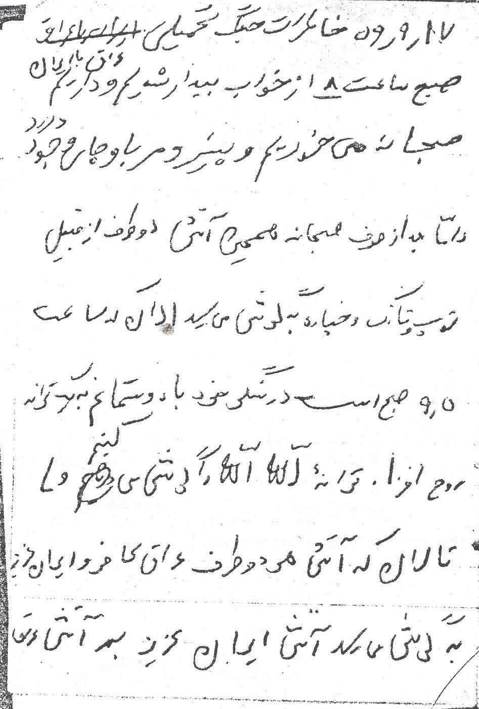 با شلیک توپخانه های بلند ما آنها مهمات و تلفات جانی دشمن بسیار زیاد است وانفجار زیاد است دشمن به آتش کشیده شد و همچنان آتش شدید در دو طرف ادامه دارد و برتری از ماست 17/9/59 خاطرات جنگ تحمیلی ایران با عراق صبح ساعت 8 از خواب بیدار شدیم و داریم صبحانه می خوریم و پنیر و مرا با و چای وجود دارد اما بعد از صرف صبحانه همین آتش دو طرف از قبیل توپ و تانک و خمپاره به گوش می رسد الان که ساعد 5/9 صبح است در سنگر خود با دوستانم به یک ترانه روح افزا ترانه الله الله را گوش می کنیم و تا الان که آتشی هر دو طرف عراق کافر و ایمان در به گوش می رسد آتش ایمان عزیز به آتش عراقی به گوش می رسد.