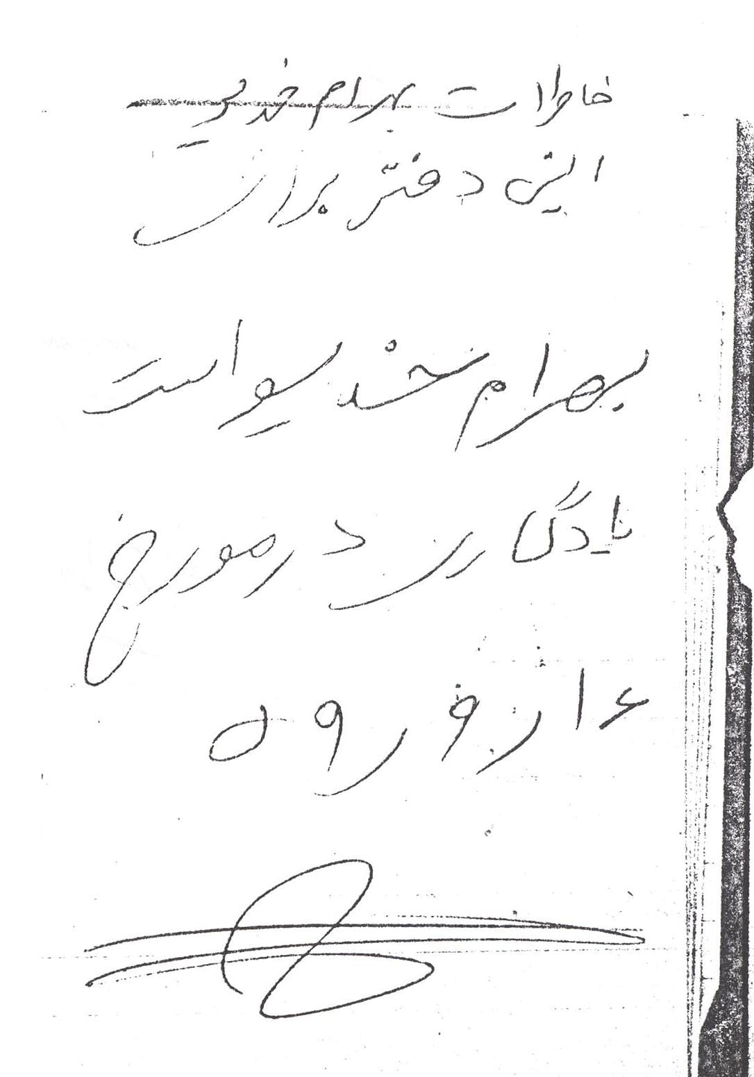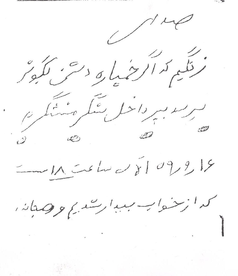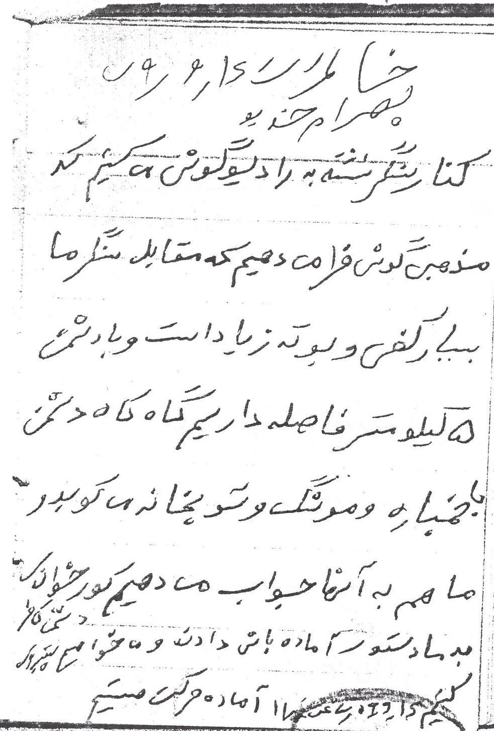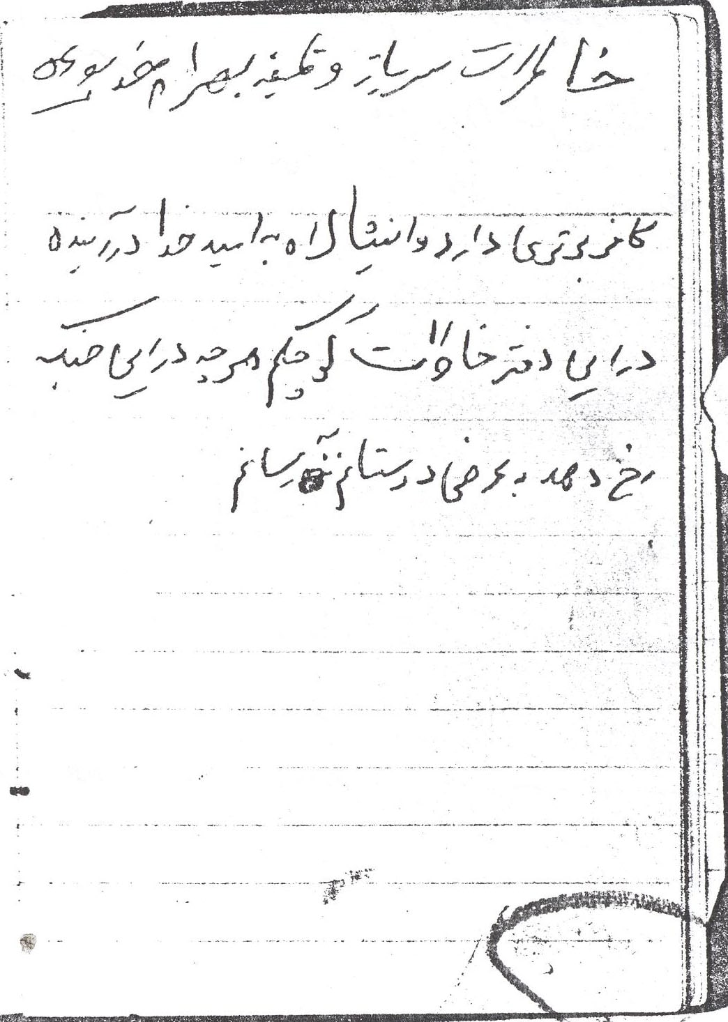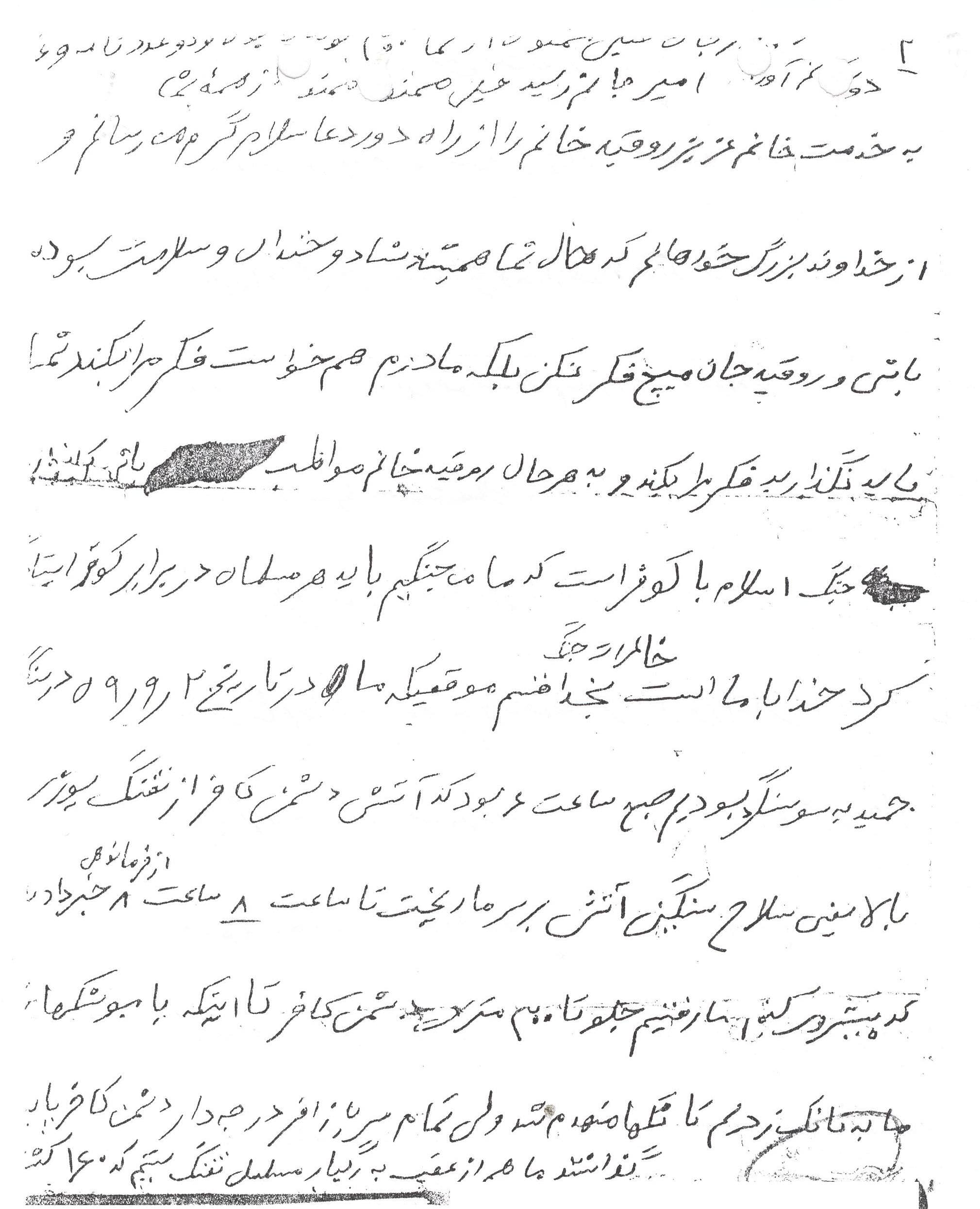 به خدمت پدر عزیزم از راه دعا سلام گرم می رسانم و از خداوند بزرگ سلامتی شما همیشه خواهانم که شما همیشه شاد و خندان باشید و من نمازم را هنوز می خوانم اگر نتوانم وضو بگیریم تیمم می کنم و نمازم را می خوانم و همیشه هم به دعاگوئی شما مشغولم و به خدمت مادرم نور چشم قوت قلبم مادر و پدر را از راه دور دعا سلام گرم دارم و مادر جانم من خیلی خیلی جایم خوب است چون ما ترسی از دشمن نداریم بلکه دشمن است که از ما ترس دارد به خداوندی خدا قسم دیگر ترسی در وجود من نیست بلکه به فکر شما هستم که شما غصه ما راه خود و باری اگر از احوالات اینجانب فرزند خود سرباز وظیفه بهرام خدیو را خواسته باشید بحمدالله ملالی در بین نیست بلکه بجز دوری شما امیدوارم که این جنگ کفر با اسلام بر پایان برسد و به خانواده های خود باز گردیم و به خدمت برادر عزیزم آقای علی خو سو را از صمیم قلب دعا سلام گرم می رسانم و امیدواریم که حال شما خوش و خرم باشید و به خدمت زن برادر گرامی از صمیم قلب دعا سلام گرم می رسانم و به خدمت پسر بردارم امیر خان عزیز را از فرسنگها راه دعا سلام گرم می رسانم او می بوسم و امیدوارم که حال امیر خوب باشد.