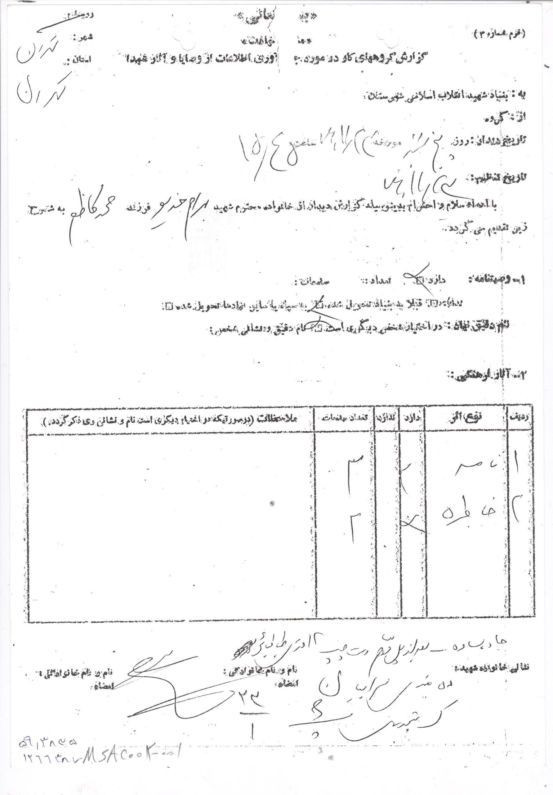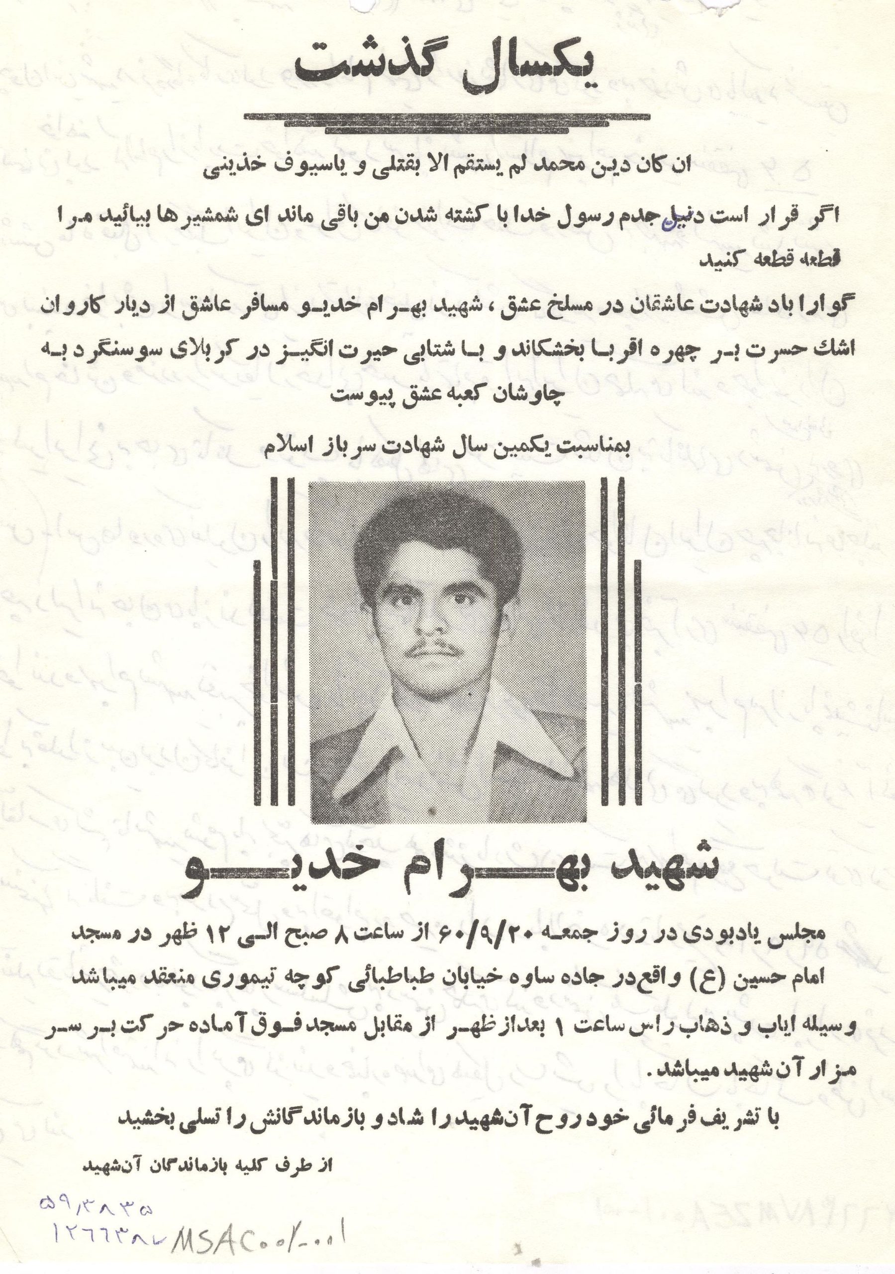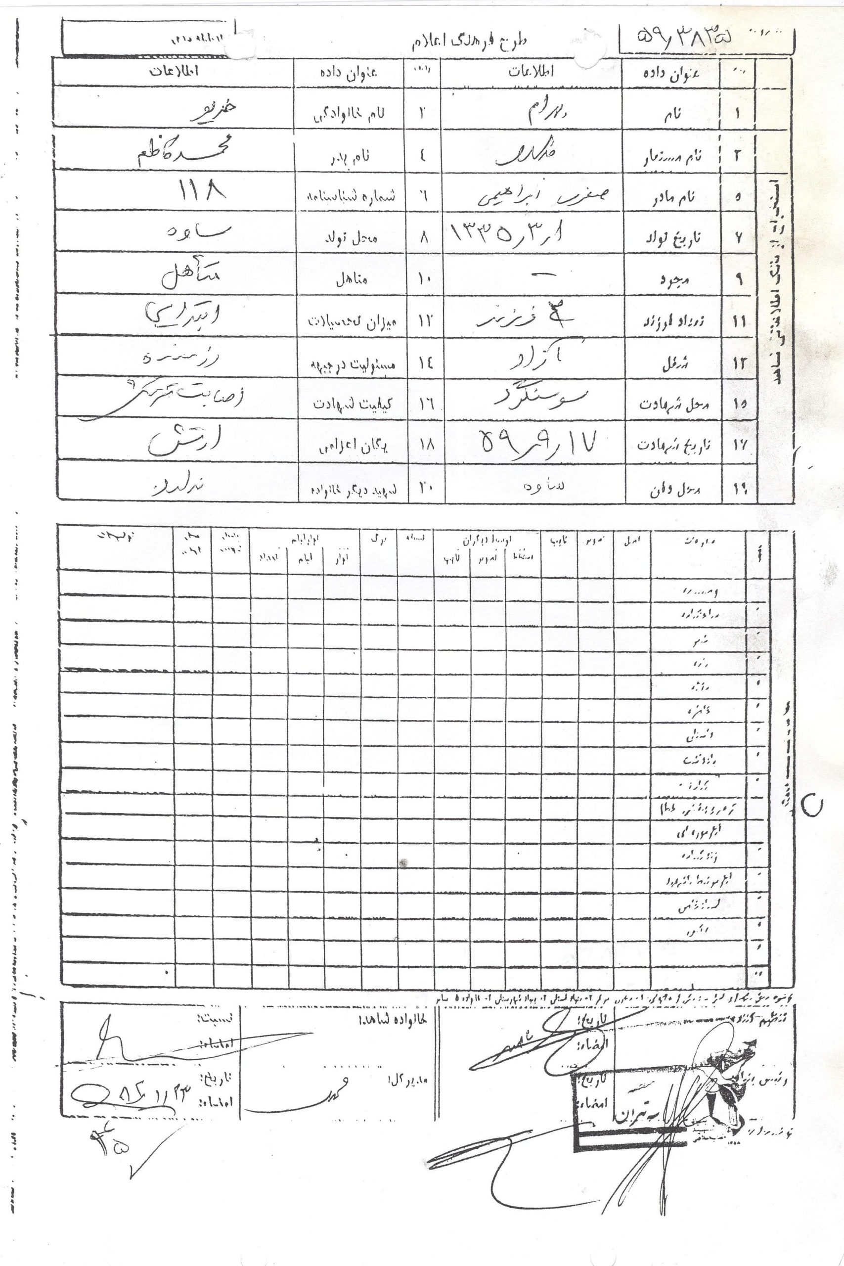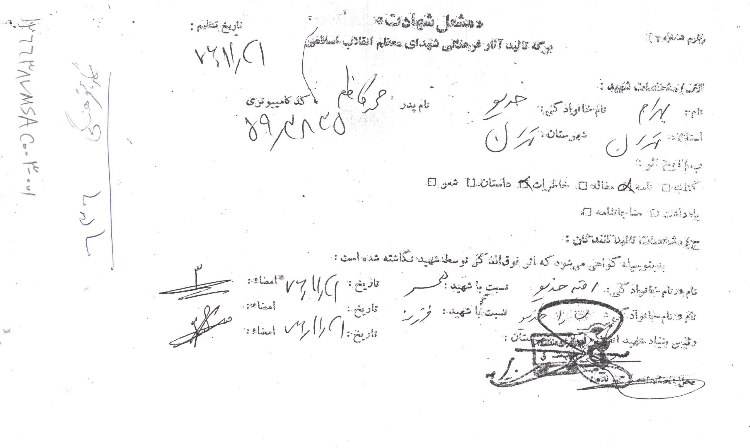 به خدمت پدر عزیزم از راه دعا سلام گرم می رسانم و از خداوند بزرگ سلامتی شما همیشه خواهانم که شما همیشه شاد و خندان باشید و من نمازم را هنوز می خوانم اگر نتوانم وضو بگیریم تیمم می کنم و نمازم را می خوانم و همیشه هم به دعاگوئی شما مشغولم و به خدمت مادرم نور چشم قوت قلبم مادر و پدر را از راه دور دعا سلام گرم دارم و مادر جانم من خیلی خیلی جایم خوب است چون ما ترسی از دشمن نداریم بلکه دشمن است که از ما ترس دارد به خداوندی خدا قسم دیگر ترسی در وجود من نیست بلکه به فکر شما هستم که شما غصه ما راه خود و باری اگر از احوالات اینجانب فرزند خود سرباز وظیفه بهرام خدیو را خواسته باشید بحمدالله ملالی در بین نیست بلکه بجز دوری شما امیدوارم که این جنگ کفر با اسلام بر پایان برسد و به خانواده های خود باز گردیم و به خدمت برادر عزیزم آقای علی خو سو را از صمیم قلب دعا سلام گرم می رسانم و امیدواریم که حال شما خوش و خرم باشید و به خدمت زن برادر گرامی از صمیم قلب دعا سلام گرم می رسانم و به خدمت پسر بردارم امیر خان عزیز را از فرسنگها راه دعا سلام گرم می رسانم او می بوسم و امیدوارم که حال امیر خوب باشد.