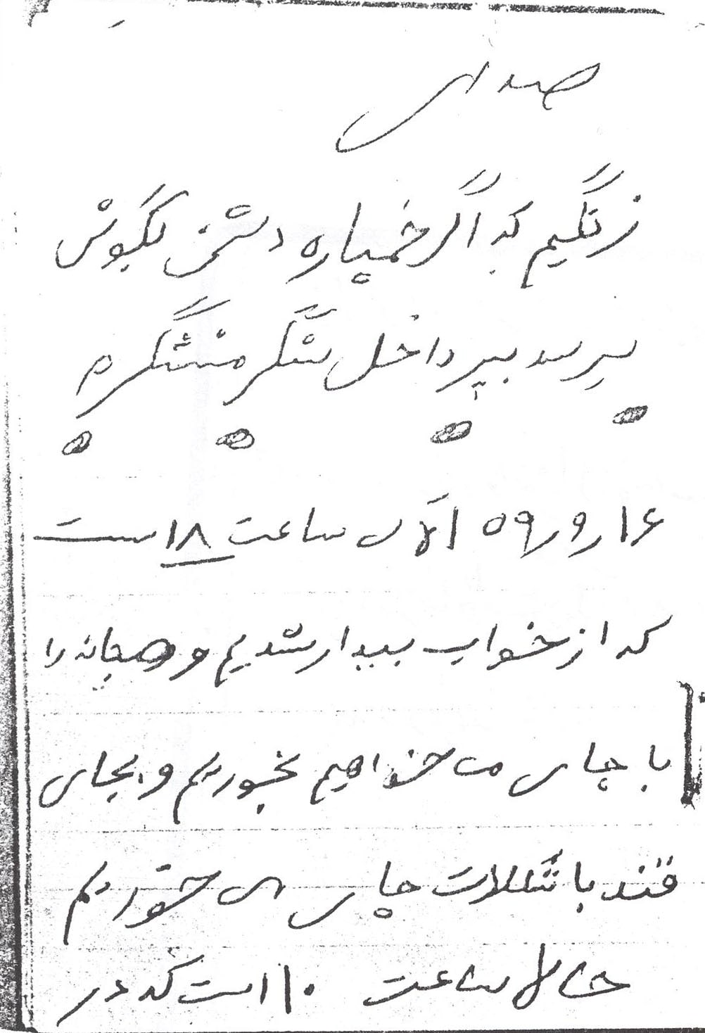 صدای زنگیم که اگر خمپاره شمن به گوش برسد به داخل لشگر متشکرم 1359/09/16 الان ساعت 8 است که از خواب بیدار شدیم و صبحانه را با چای می خواهیم بخوریم و بجای قند با شکلات چای می خوریم حالا ساعت 10 است که در کافر برتری دارد و ایشان به امید خدا در آینده در این دفتر خاطرات کوچکم هرچه در این جنگ رخ دهد به عرض دوستانم می رسانم.