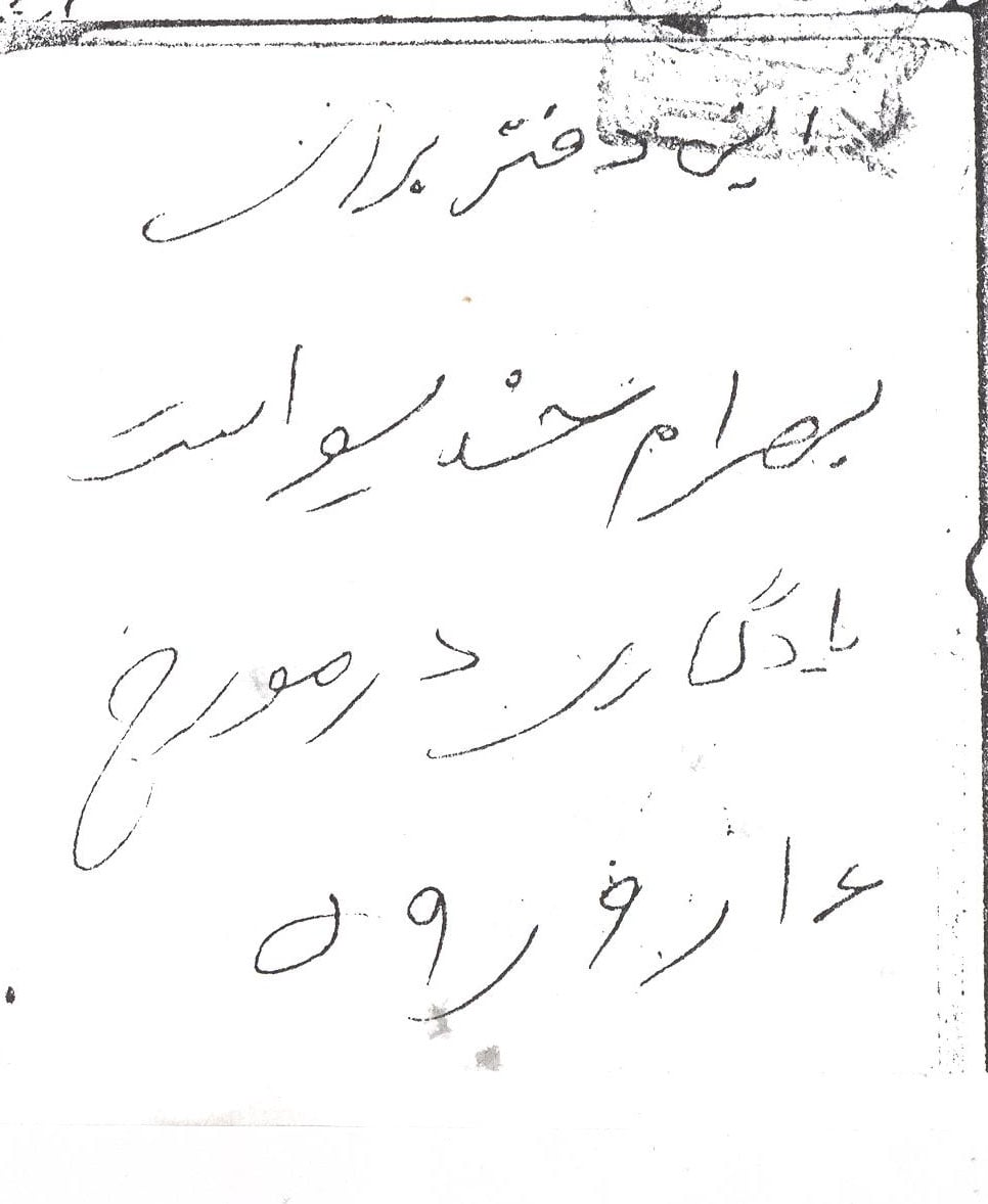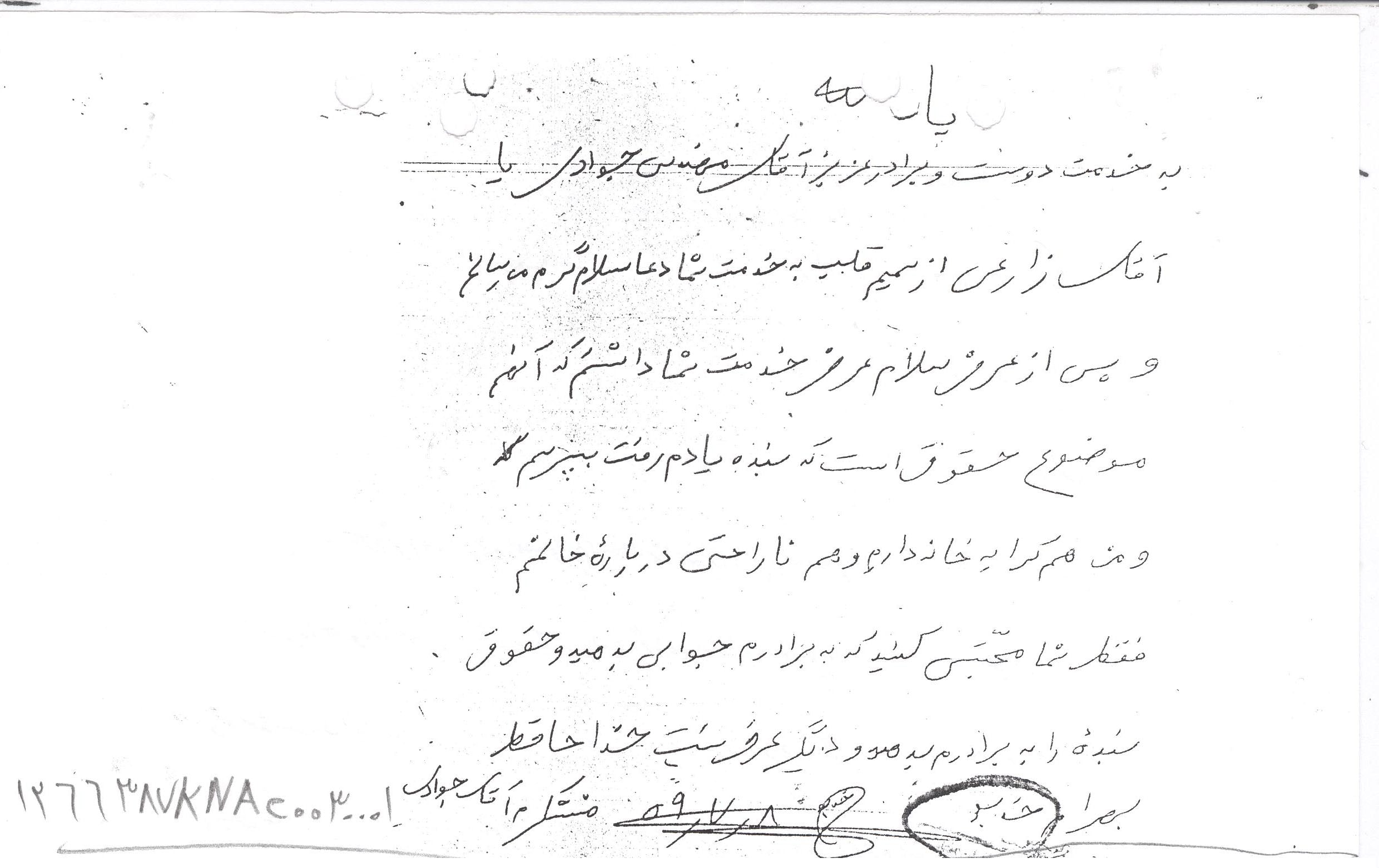 خدمت خواهرانم کبری و زهرا و طاهر خانم همگی شما از راه دور می بوسم و به گوئی شما مشغول هستیم و از خدای بزرگ سلامتی شما را خواهانم و به زن عموی گرامی مریم خانم از راه دور دعا سلام گرم می رسانم. عمو مریم خانم من چاکرمان هستم و امیدوارم همیشه در پناه خدا و بزرگ باشی و به خدمت دائی خداوردی با خانواده دعا سلام گرم می رسانم و امیدورام که حال شما خوب باشد و به خدمت دائی ؟؟ با خانواده دعا سلام گرم می رسانم و به خدمت مادر بزرگ عزیزم دعا سلام گرم می رسانم و امیدوارم که حال مادر بزرگ خوب باشد به تمام دوستان و همسایگان دعا سلام می رسانم .
