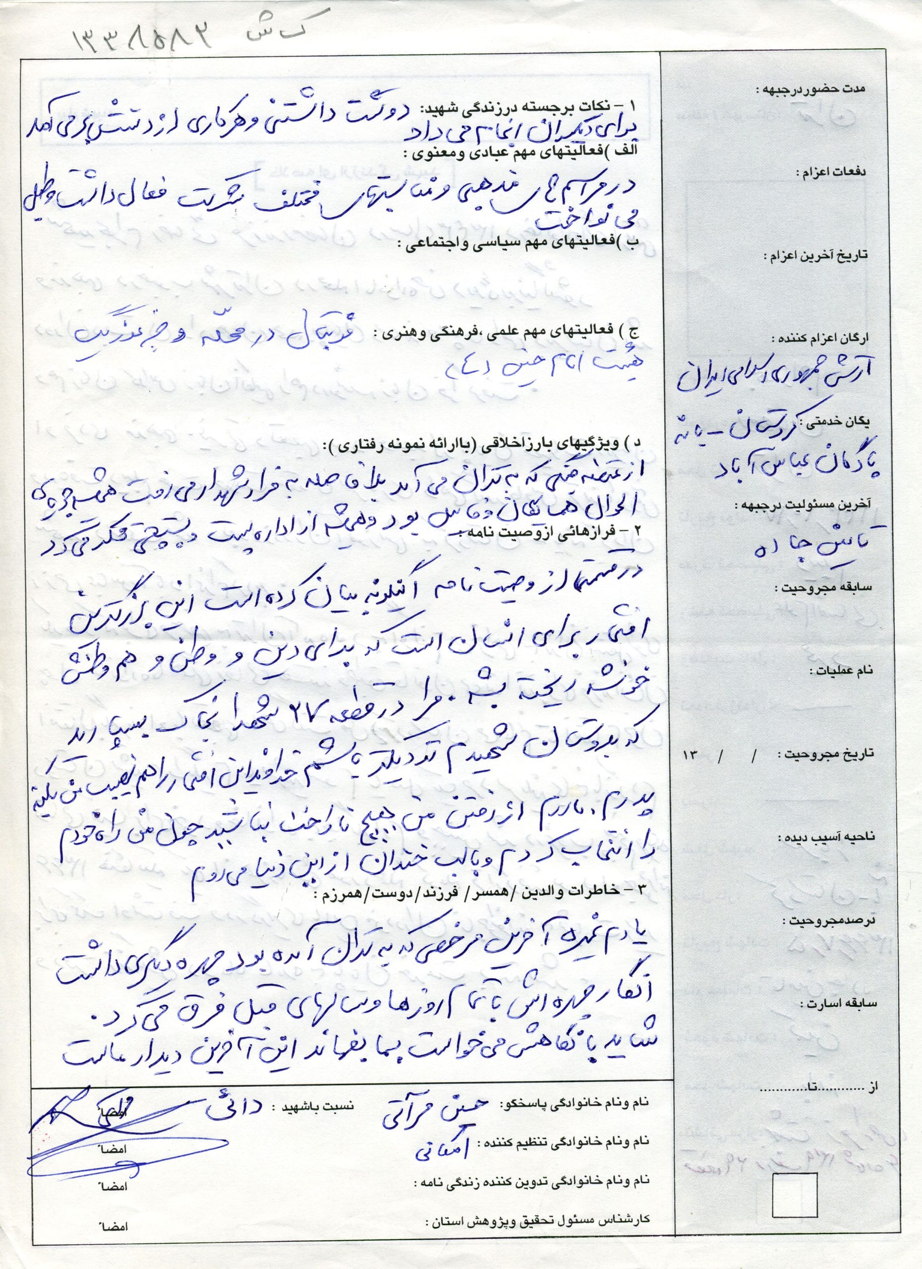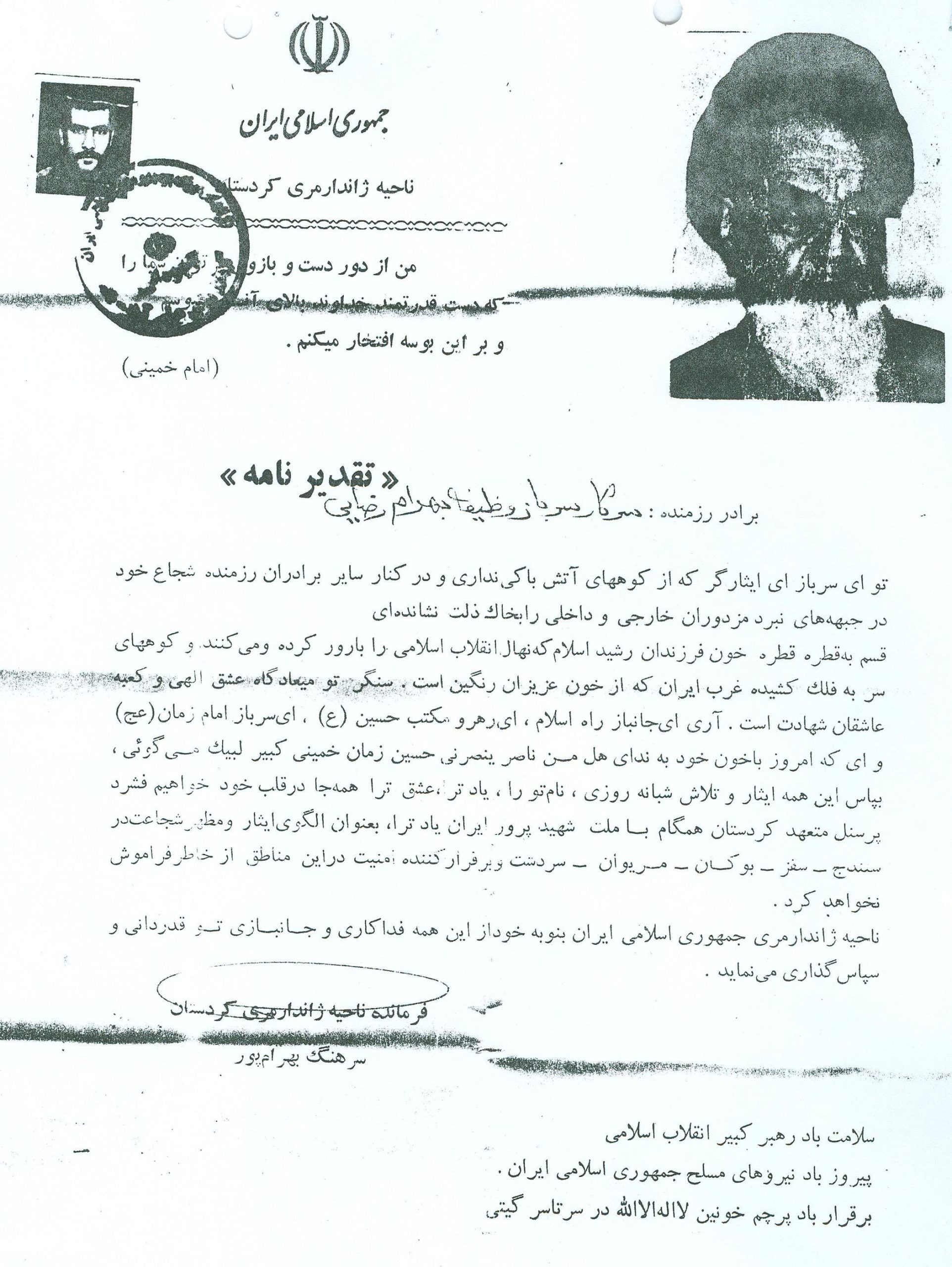 در محل مان امامزاده حسن یا در کردستان پادگان عباس آباد یا در بانه پایگاه گردنه همیشه مورد احترام دوستان بود فردی از خود گذشته و ایثارگر بود و هیچگاه چیزی را برای خود نمی خواست. بارها این مطلب را بیان می کرد که من می خواهم با سرافرازی و سربلندی بخانه بازگردم و عاقبت نیز چنین شد در شامگاه 1366/07/05 در پایگاه گردنه شهید رضائی فعلی به گفته دوستانش زمانیکه به مدد و کمک هم سنگرش که در کمین دمکرات خائن مجروح شده بود و او نمی توانست بی تفاوت باشد به کمک و یاری هم سنگرش شتافت که در درگیری نابرابر و ناجوانمردانه به شهادت رسید و بنا بر خواست و آرزوی دیرینه اش عاقبت در بانه به ندای حق لبیک گفته و بدیدار معبود شتافت و به لقا ا… پیوست والسلام