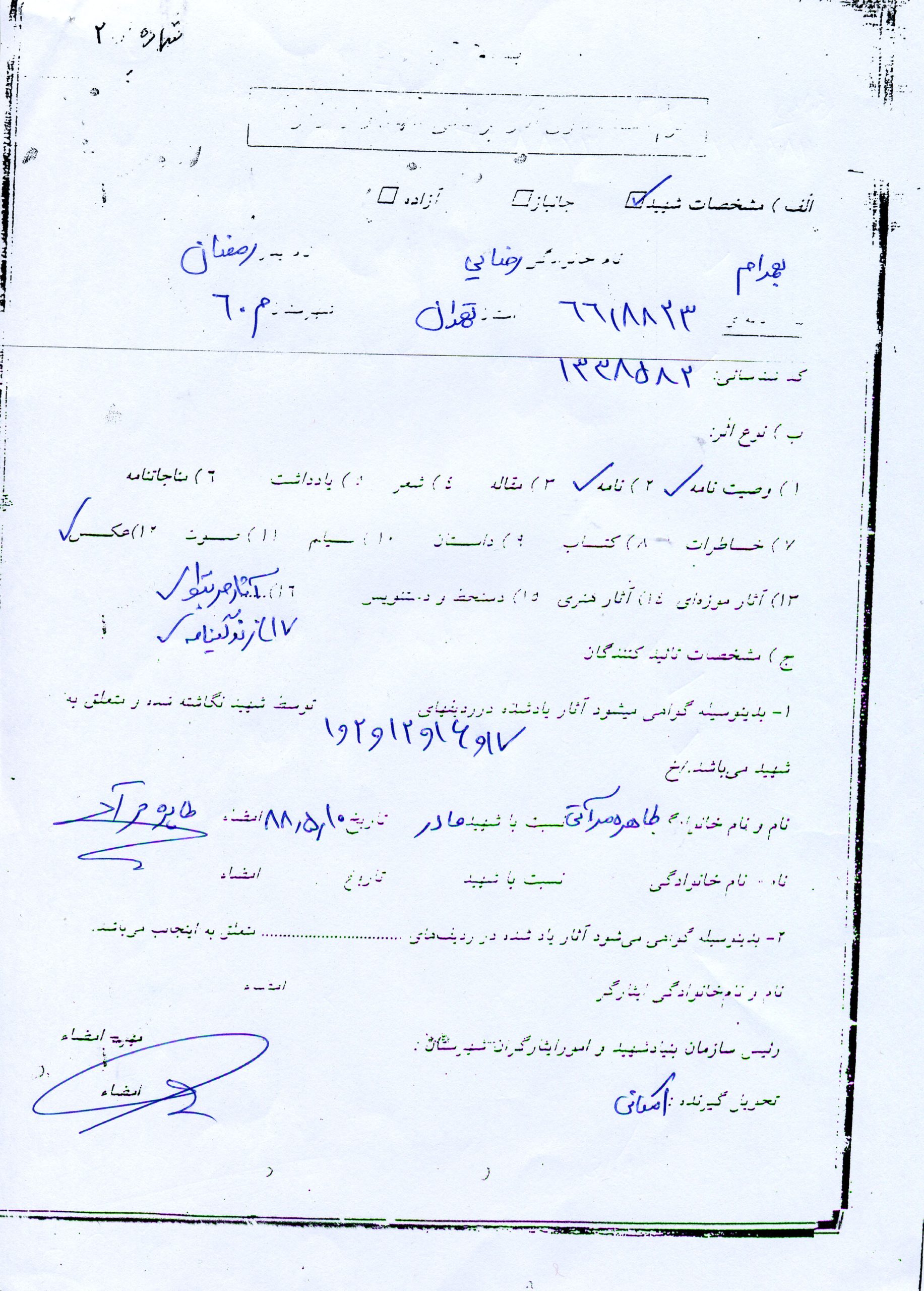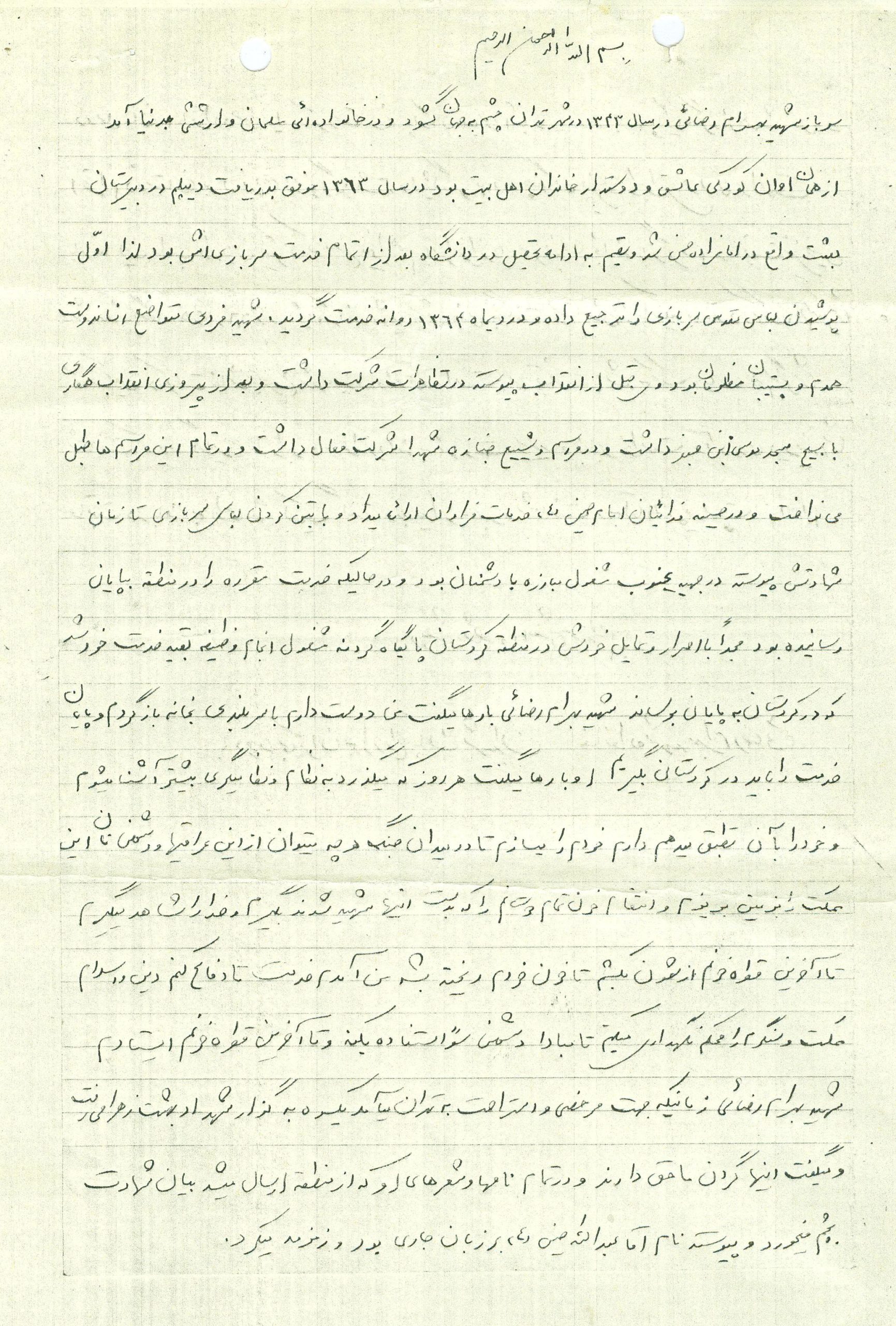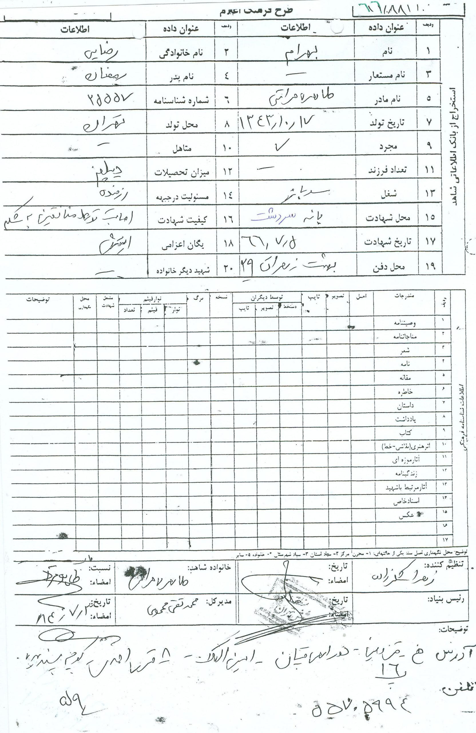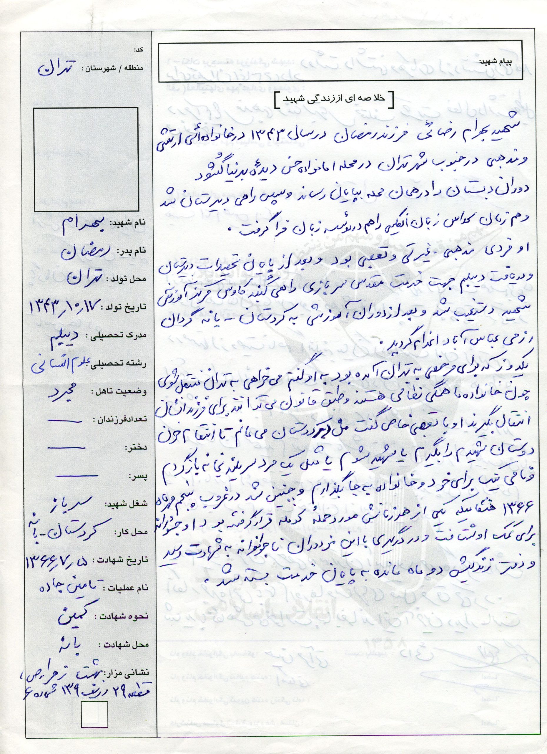 سرباز شهید بهرام رضائی در سال 1343 چشم به جهان گشود و در خانواده ای مسلمان و ارتشی بدنیا آمد. از همان اوان کودکی عاشق و دوستدار خاندان اهل بیت در سال 1363 موفق بدریافت دیپلم در دبیرستان بعثت واقع در امامزاده حسن شد و تصمیم به ادامه تحصیل در دانشگاه بعد از اتمام خدمت سربازی اش بود لذا اول پوشیدن لباس مقدس سربازی را ترجیح داده و در دیماه 1364 روانه خدمت گردید. شهید فردی متواضع انساندوست همدم و پشتیبان مظلومان بود وی قبل از انقلاب پیوسته در تظاهرات شرکت داشت و بعد از پیروزی انقلاب همکاری با بسیج مسجد موسی ابن جعفر داشت و در مراسم و تشییع جنازه شهدا شرکت فعال داشت و در تمام این مراسم ها طبل می نواخت و در حسینیه فدائیان امام حسین (ع) خدمات فراوان ارائه می داد و با بتن کردن لباس سربازی تا زمان شهادتش پیوسته در جبهه جنوب مشغول مبارزه با دشمنان بود و در حالیکه خدمت مقرره را در منطقه بپایان رسانیده بود مجددا با اصرار و تمایل خودش در منطقه کردستان پایگاه گردنه مشغول انجام وظیفه بقیه خدمت خود شد که در کردستان به پایان برساند شهید بهرام رضائی بارها می گفت من دوست دارم با سربلندی بخانه بازگردم و پایان خدمت را باید در کردستان بگیریم او بارها می گفت هر روز که می گذرد به نظام و نظامیگری بیشتر آشنا می شوم و خود را بآن تطبیق می دهم دارم خودم را می سازم تا در میدان جنگ هر چه می توان از این عراقیها و دشمن تان این ممکت را بزمین بریزم و انتقام خون تمام دوستانم را که بدست اینها شهید شدند بگیرم و خدا را شاهد میگیرم تا آخرین قطره خونم ازشون بکشم تا خون خودم ریخته شد من آمدم خدمت تا دفاع کنم دین و اسلام ممکت و سنگرم را محکم نگهداری می کنم تا مبادا دشمن سوء استفاده بکند و تا آخرین قطره خونم ایستادم شهید بهرام رضائی زمانیکه جهت مرخصی و استراحت به تهران میامد یکسره به گلزار شهدا و بهشت زهرا می رفت و می گفت اینها گردن ما حق دارند و در تمام نامها و شعرهای او که از منطقه ارسال می شد بیان شهادت بچشم می خورد و پیوسته نام آقا عبد ا… حسین (ع) بر زبان جاری بود و زمزمه می کرد.