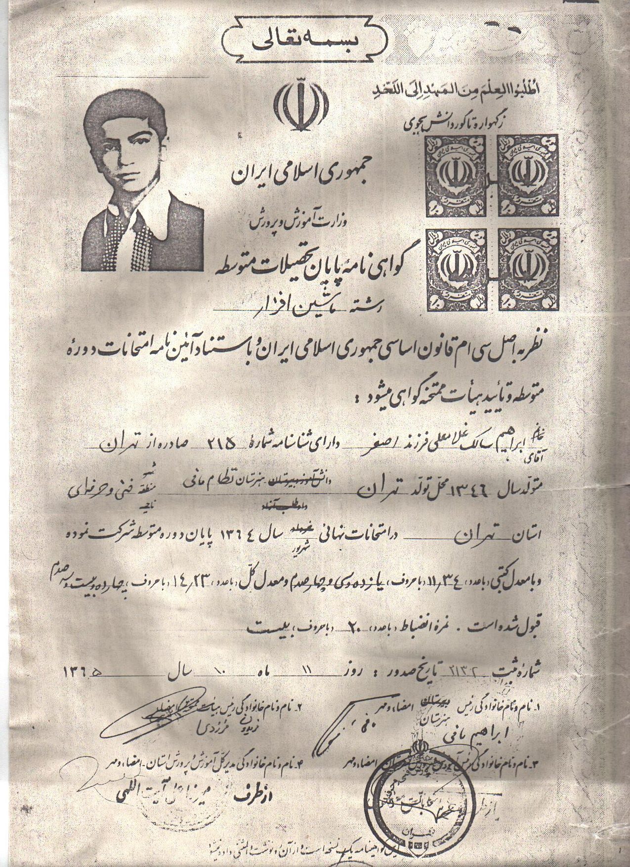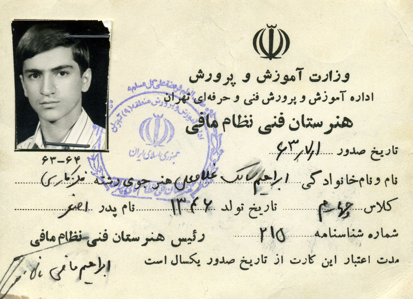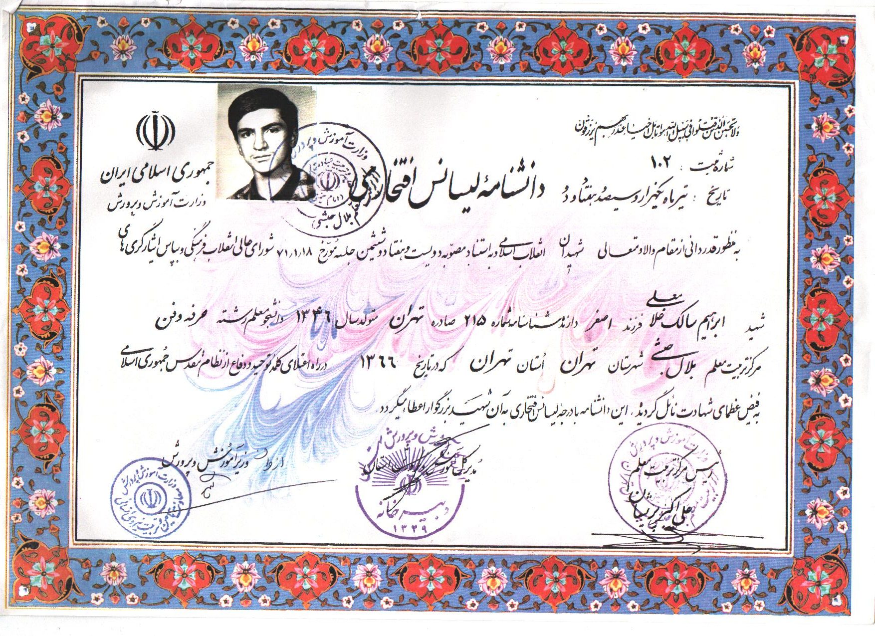 وي بعد از اتمام تحصيلات و كسب ديپلم فني از هنرستان نظام مافي در آزمون سراسري تربيت معلم شركت كرده و توانست به حول و قوه الهي در اين آزمون قبول شود و سهميه تهران به قرعه او افتاد در مركز تربيت معلم بلال حبشي مشغول تحصيل شد و از امتحانات سال اول سربلند خارج شد و وارد سال دوم رشته حرفه وفن شد تا اينكه در تاريخ 1365/9/11 از طرف مركز تربيت در سپاه يكصد هزار نفري سپاه محمد (ص) ثبت نام نموده و حدود2ماه آموزشهاي متفاوت زير نظر سپاه پاسداران انقلاب اسلامي تيپ ويژه 66 هوابر فرا گرفت در تاريخ 65/11/15 به نقده رفت و در مسابقات قرآن شركت كرده و توانست يك جلد كلام الله مجيد از امام جمعه نقده دريافت نمايد و از همانجا راهي جبهه شد يكبار به مرخصي آمد و سه روز مانده به عيد مجدداً به جبهه برگشت.