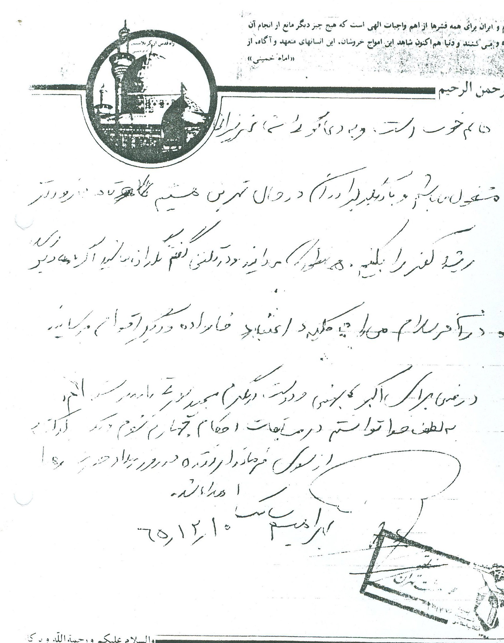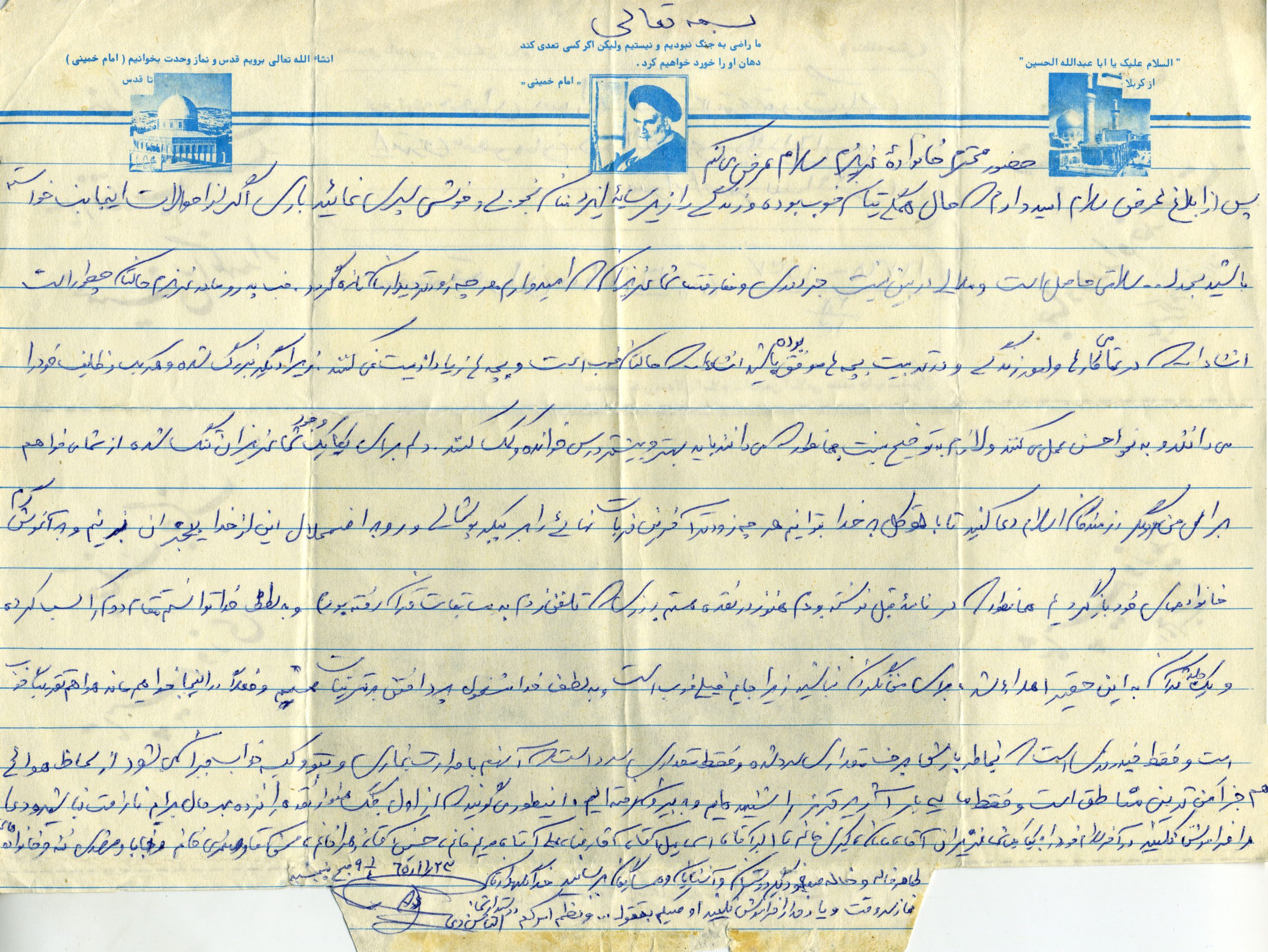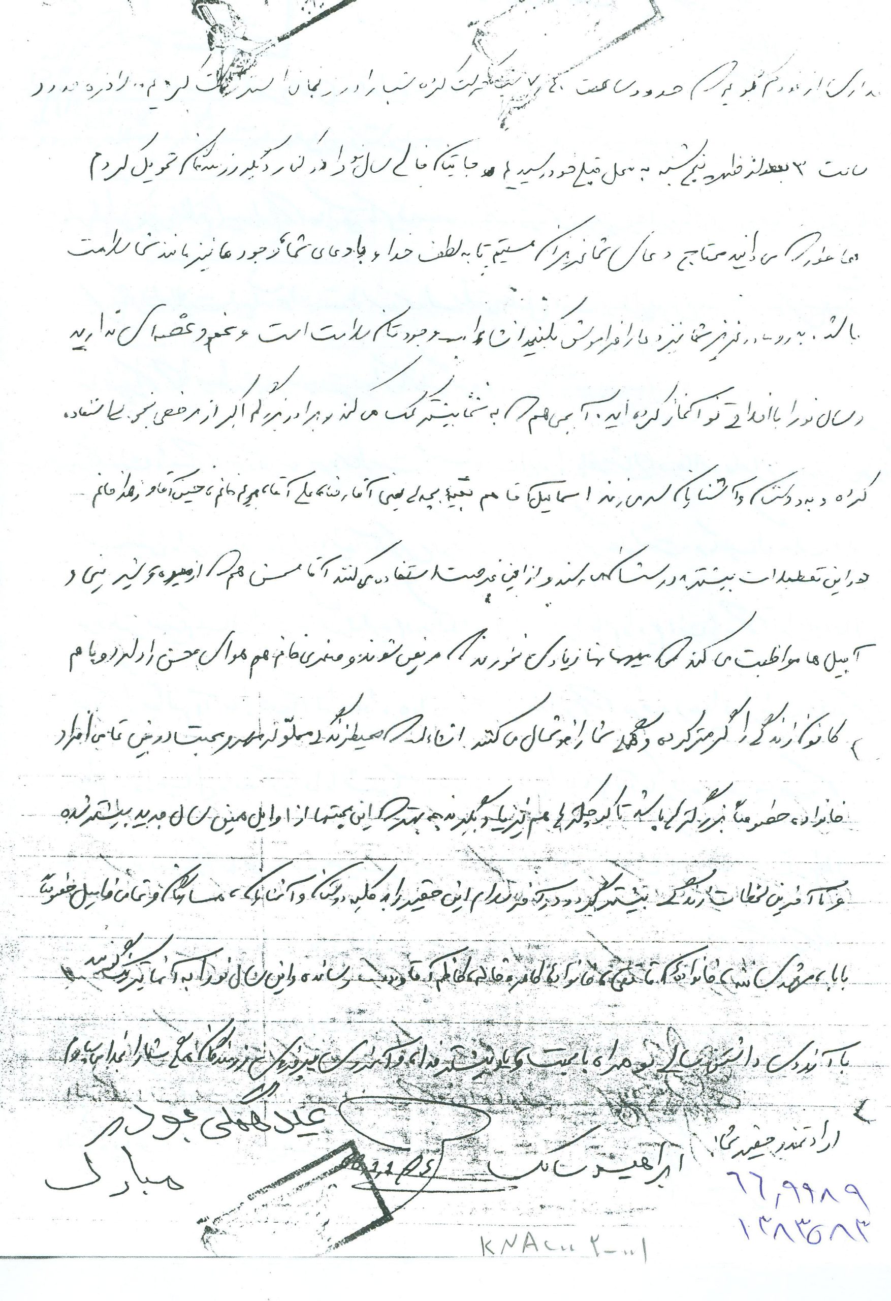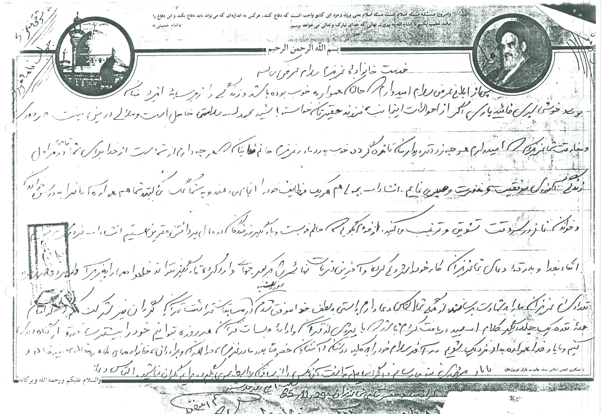 انشاءاله كه حالتان خوب است و بچهها زياد اذيت نميكنند زيرا ديگر بزرگ شده و هر يك وظايف خود را ميدانند و به نحو احسن عمل ميكنند و لازم به توضيح نيست همانطور كه ميدانند بايد بهتر و بيشتر درس خوانده و كمك كنند. دلم براي يكايك وجود شما عزيزان تنگ شده واز شما ميخواهم براي من و ديگر رزمندگان اسلام دعا كنيد تا با توكل به خدا بتوانيم هر چه زودتر آخرين ضربات نهايي را بر پيكر پوشالي و روبه اضمحلال اين از خدا بي خبران بزنيم و به آغوش گرم خانوادههاي خود بازگرديم. همانطور كه در نامه قبل نوشته بودم هنوز در نقده هستم و روزهايي كه تلفن زدم به مسابقات قرآن رفته بودم و به لطف خدا توانستم مقام دوم را كسب كرده و يك جلد قرآن به اين حقير اهدا شده براي من نگران نباشيد زيرا جايم خيلي خوب است و به لطف خدا مشغول پرداختن به تمرينات هستيم و فعلاً در اينجا خواهيم ماند هوا هم تقريباً خوب است و فقط چند روزي است كه به خاطر بارش برف مقداري سرد شده و فقط مقداري سرد است كه آنهم با حرارت بخاري و پتو و كيسه خواب جبران ميشود از لحاظ هوايي هم جز امنترين مناطق است و فقط ما 3بار آژير قرمز را شنيدهايم و به بيرون رفتهايم. اين طور ميگويند كه از اول جنگ هنوز نقده را نزده به هر حال برايم ناراحت نباشيد و دعا را فراموش نكنيد. در آخر سلام خود را به يكايك شما عزيزان آقا، مامان، كبريخانم، اكبرآقا، اسماعيلآقا، آقا رضا، عليآقا، مريم خانم، حسينآقا، زهرا خانم، محسنآقا، و صغري خانم و بابا و مشهدي ننه و خانوادههاي طاهره خاله و خاله صغري و ديگر دوستان و آشنايان و همسايگان برسانيد خدا نگهدارتان نماز سروقت و ياد خدا را فراموش نكنيد اوصيكم بقوا الله ونطم امركم.