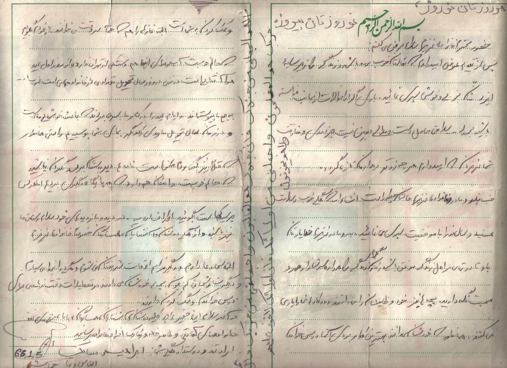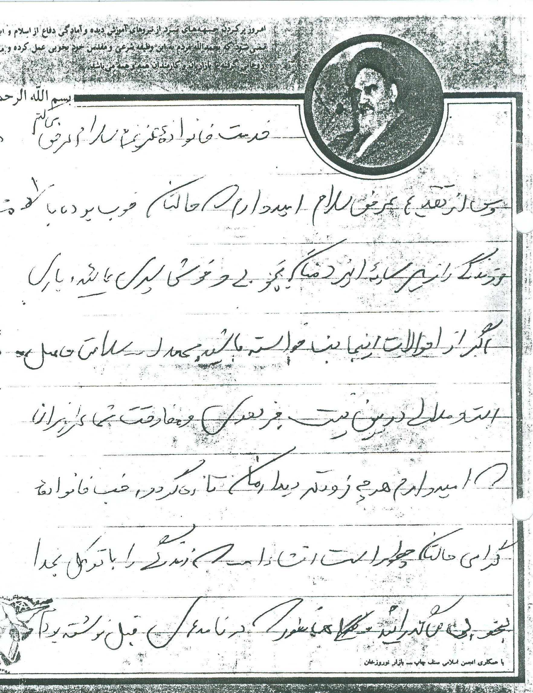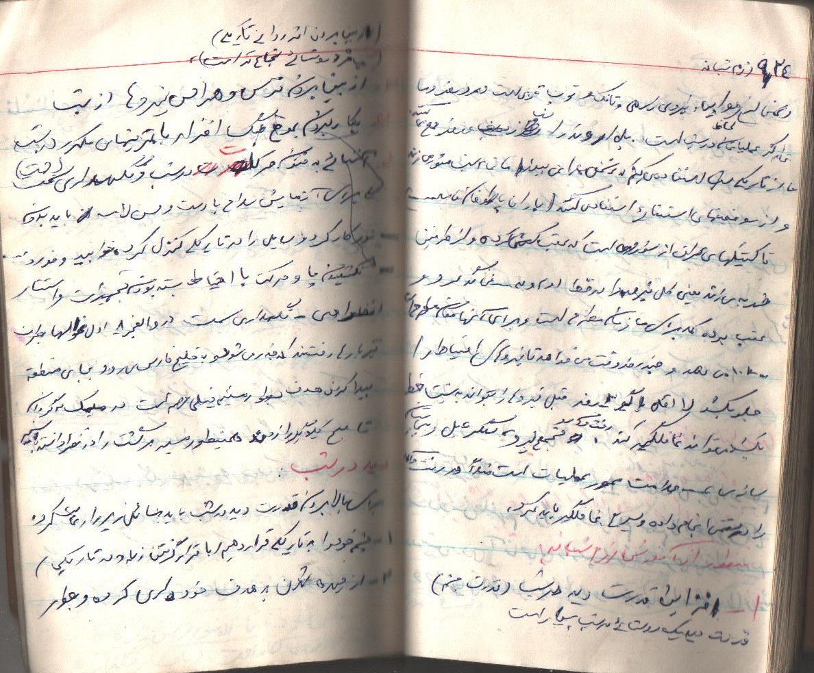 انشاءاله كه حالتان خوب است و بچهها زياد اذيت نميكنند زيرا ديگر بزرگ شده و هر يك وظايف خود را ميدانند و به نحو احسن عمل ميكنند و لازم به توضيح نيست همانطور كه ميدانند بايد بهتر و بيشتر درس خوانده و كمك كنند. دلم براي يكايك وجود شما عزيزان تنگ شده واز شما ميخواهم براي من و ديگر رزمندگان اسلام دعا كنيد تا با توكل به خدا بتوانيم هر چه زودتر آخرين ضربات نهايي را بر پيكر پوشالي و روبه اضمحلال اين از خدا بي خبران بزنيم و به آغوش گرم خانوادههاي خود بازگرديم. همانطور كه در نامه قبل نوشته بودم هنوز در نقده هستم و روزهايي كه تلفن زدم به مسابقات قرآن رفته بودم و به لطف خدا توانستم مقام دوم را كسب كرده و يك جلد قرآن به اين حقير اهدا شده براي من نگران نباشيد زيرا جايم خيلي خوب است و به لطف خدا مشغول پرداختن به تمرينات هستيم و فعلاً در اينجا خواهيم ماند هوا هم تقريباً خوب است و فقط چند روزي است كه به خاطر بارش برف مقداري سرد شده و فقط مقداري سرد است كه آنهم با حرارت بخاري و پتو و كيسه خواب جبران ميشود از لحاظ هوايي هم جز امنترين مناطق است و فقط ما 3بار آژير قرمز را شنيدهايم و به بيرون رفتهايم. اين طور ميگويند كه از اول جنگ هنوز نقده را نزده به هر حال برايم ناراحت نباشيد و دعا را فراموش نكنيد. در آخر سلام خود را به يكايك شما عزيزان آقا، مامان، كبريخانم، اكبرآقا، اسماعيلآقا، آقا رضا، عليآقا، مريم خانم، حسينآقا، زهرا خانم، محسنآقا، و صغري خانم و بابا و مشهدي ننه و خانوادههاي طاهره خاله و خاله صغري و ديگر دوستان و آشنايان و همسايگان برسانيد خدا نگهدارتان نماز سروقت و ياد خدا را فراموش نكنيد اوصيكم بقوا الله ونطم امركم.