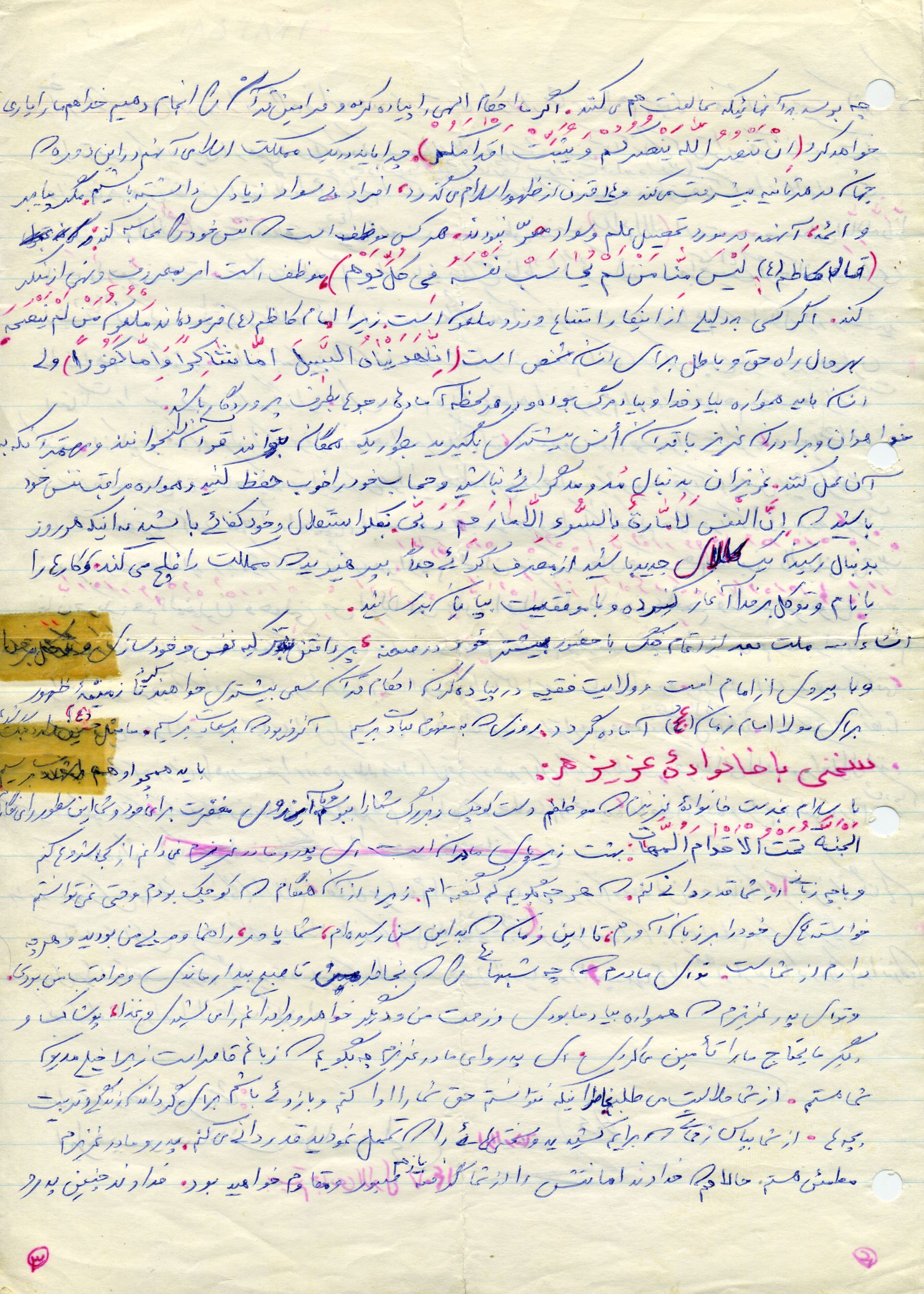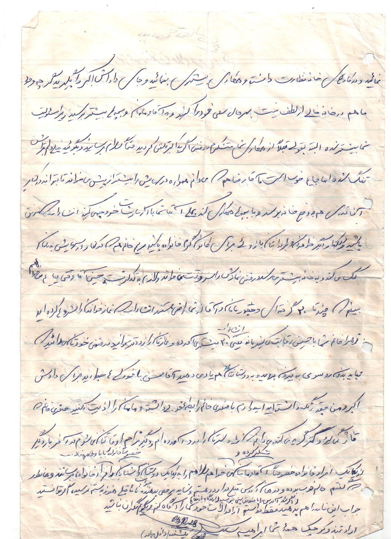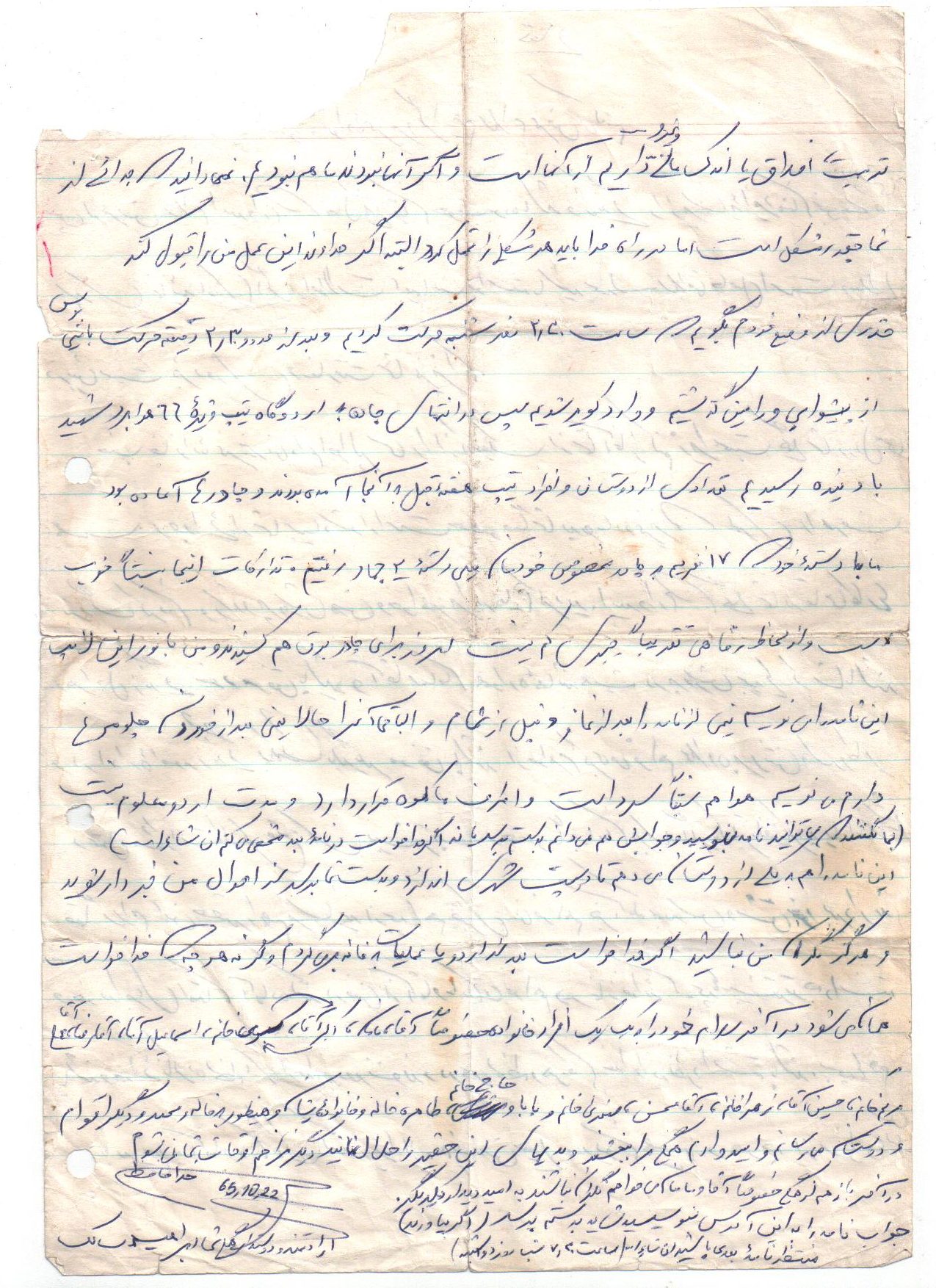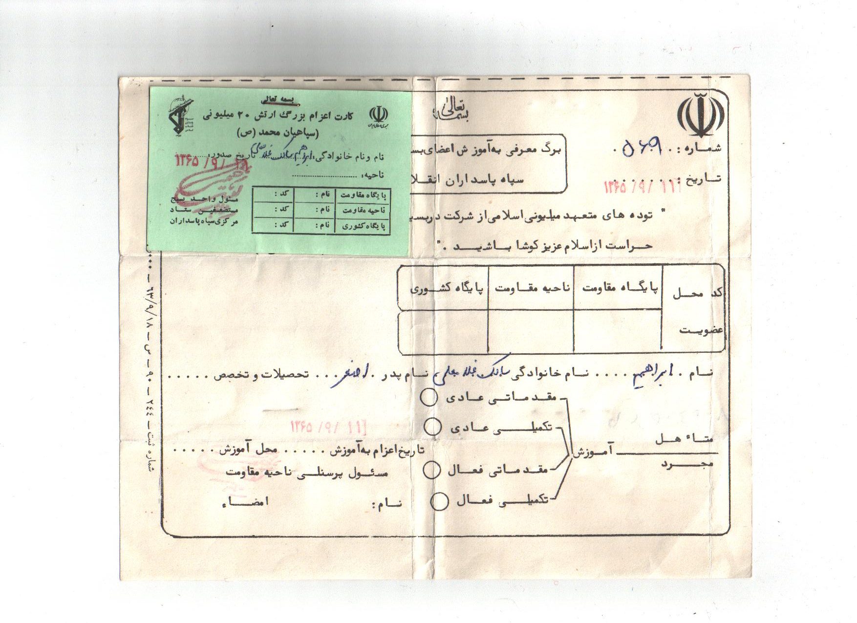 انشاءاله كه حالتان خوب است و بچهها زياد اذيت نميكنند زيرا ديگر بزرگ شده و هر يك وظايف خود را ميدانند و به نحو احسن عمل ميكنند و لازم به توضيح نيست همانطور كه ميدانند بايد بهتر و بيشتر درس خوانده و كمك كنند. دلم براي يكايك وجود شما عزيزان تنگ شده واز شما ميخواهم براي من و ديگر رزمندگان اسلام دعا كنيد تا با توكل به خدا بتوانيم هر چه زودتر آخرين ضربات نهايي را بر پيكر پوشالي و روبه اضمحلال اين از خدا بي خبران بزنيم و به آغوش گرم خانوادههاي خود بازگرديم. همانطور كه در نامه قبل نوشته بودم هنوز در نقده هستم و روزهايي كه تلفن زدم به مسابقات قرآن رفته بودم و به لطف خدا توانستم مقام دوم را كسب كرده و يك جلد قرآن به اين حقير اهدا شده براي من نگران نباشيد زيرا جايم خيلي خوب است و به لطف خدا مشغول پرداختن به تمرينات هستيم و فعلاً در اينجا خواهيم ماند هوا هم تقريباً خوب است و فقط چند روزي است كه به خاطر بارش برف مقداري سرد شده و فقط مقداري سرد است كه آنهم با حرارت بخاري و پتو و كيسه خواب جبران ميشود از لحاظ هوايي هم جز امنترين مناطق است و فقط ما 3بار آژير قرمز را شنيدهايم و به بيرون رفتهايم. اين طور ميگويند كه از اول جنگ هنوز نقده را نزده به هر حال برايم ناراحت نباشيد و دعا را فراموش نكنيد. در آخر سلام خود را به يكايك شما عزيزان آقا، مامان، كبريخانم، اكبرآقا، اسماعيلآقا، آقا رضا، عليآقا، مريم خانم، حسينآقا، زهرا خانم، محسنآقا، و صغري خانم و بابا و مشهدي ننه و خانوادههاي طاهره خاله و خاله صغري و ديگر دوستان و آشنايان و همسايگان برسانيد خدا نگهدارتان نماز سروقت و ياد خدا را فراموش نكنيد اوصيكم بقوا الله ونطم امركم.