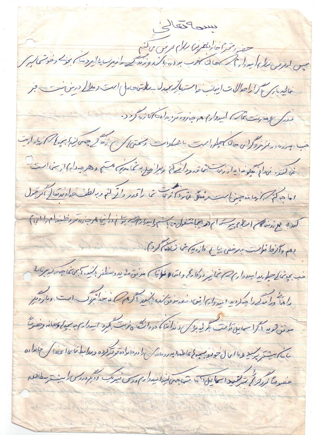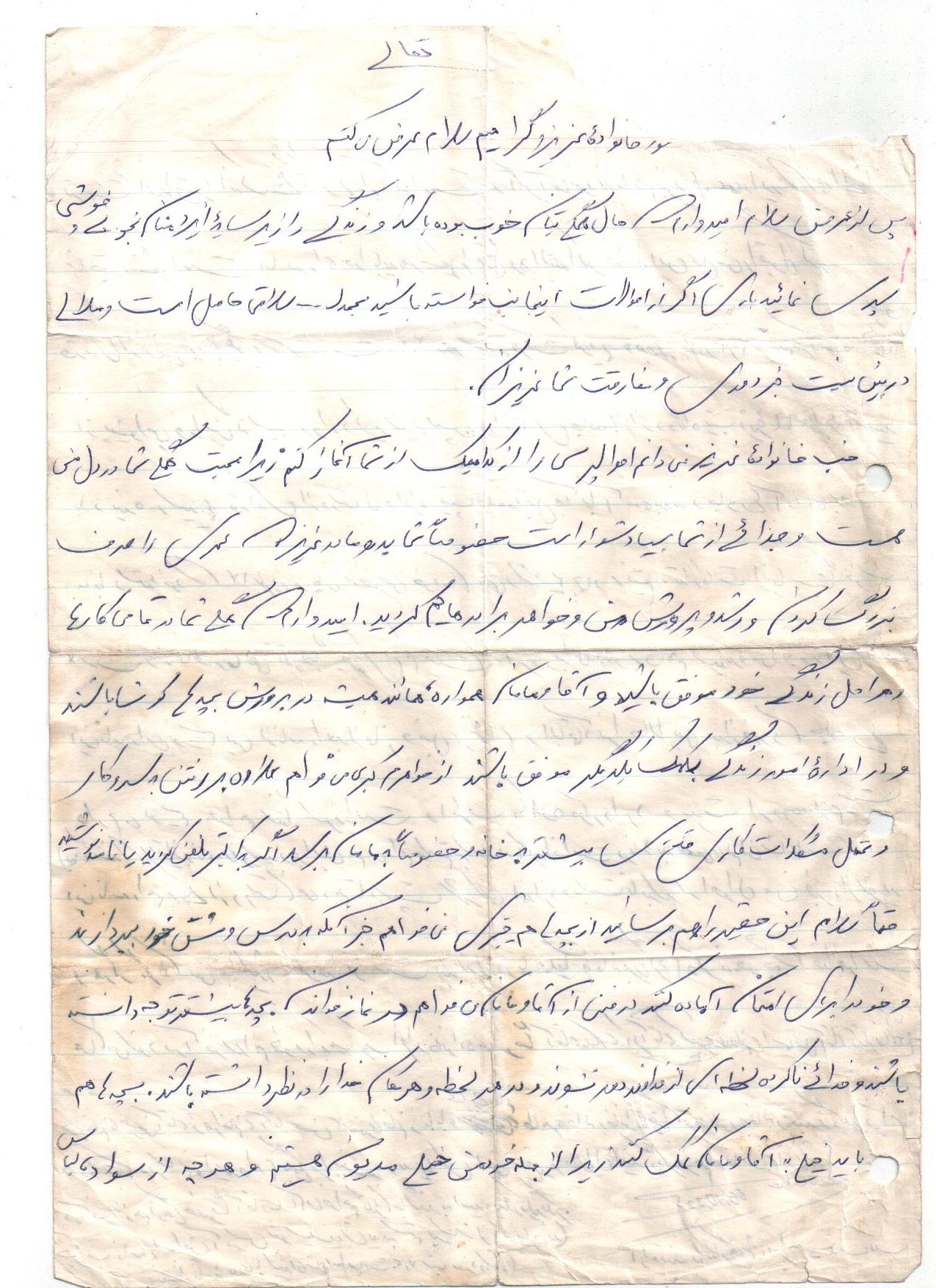پس از ابلاغ عرض سلام اميدوارم كه حال همگيتان خوب بوده و زندگي را زير سايه ايزدمنان بخوبي و خوشي سپري نماييد. باري اگر از احوالات اينجانب خواسته باشيد بحمداله سلامتي حاصل است و ملالي در بين نيست جز دوري و مفارقت شما عزيزان كه اميدوارم هر چه زودتر ديدارمان تازه گردد. خوب پدر و مادر عزيزم حالتان چطور است انشاءاله كه در تمامي كارها و امور زندگي و در تربيت بچهها موفق بوده باشيد.