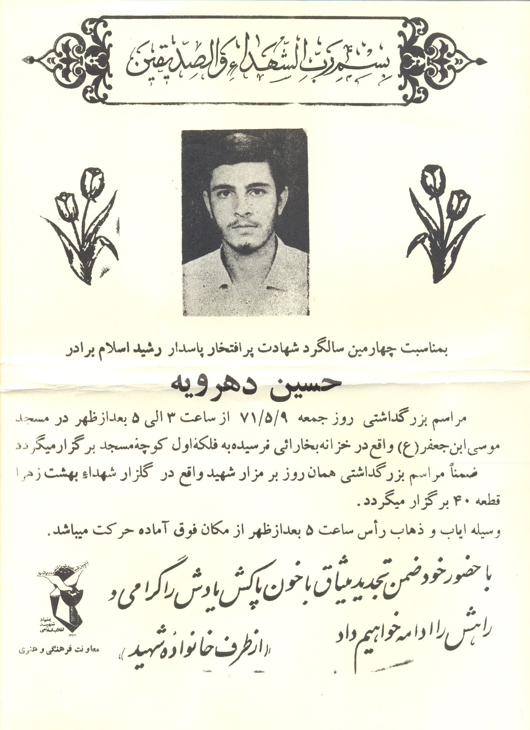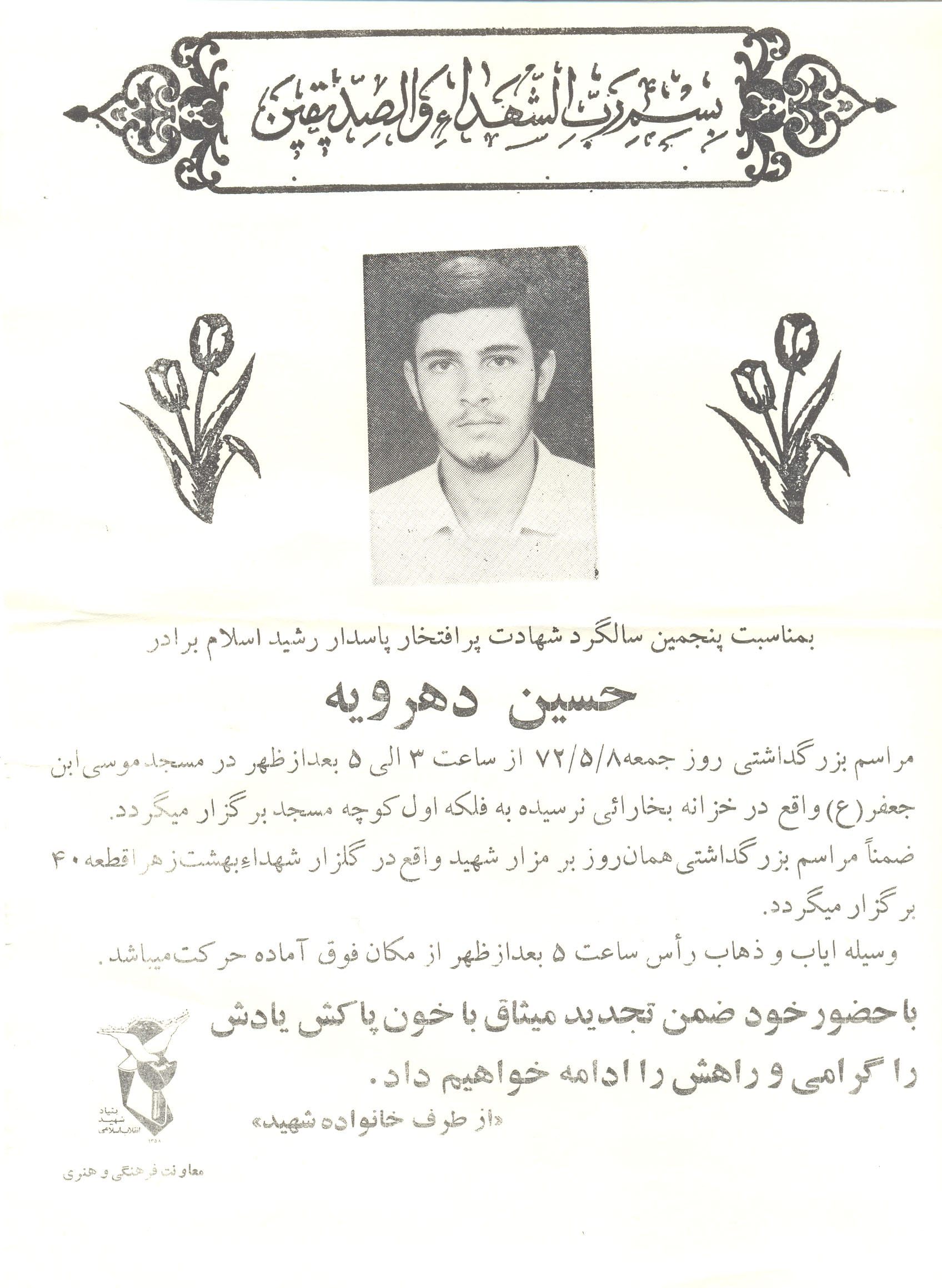 ـ در آخر از شما برادر عزيزم حسين دهرويه كه عازم ديار عاشقان، جبهه هاي نبرد حق عليه باطل هستيد التماس دعا داريم و اميدواريم كه در آنجا به ياد ما باشيد و ما هم در پشت جبهه ها به ياد شما دلاوران وكفر ستيزان در جبهه هاي نبرد حق عليه باطل هستيم و اميدواريم كه به سلامتي انشاءالله برويد و در صحت و سلامتي به خانه تان بازگرديد ولي خلاصه اگر خداوند لياقتي هم داد و لقاءالله را از نزديك در آغوش گرفتيد و به همان فيض عظيم شهادتي كه فرموديد نائل شديد، اين گناهكاران و روسياهان را فراموش نكنيد و اميدواريم كه اولاً ائمه اطهار8و صالحان و شهدا ما را شفاعت كنند، ثانياً شما عزيز درگه حق ما را در روز جزا از شفاعت خود محروم نكنيد چرا كه شهيد مي تواند امت دياري را شفاعت كند و اين قول را از شما مي خواهيم.