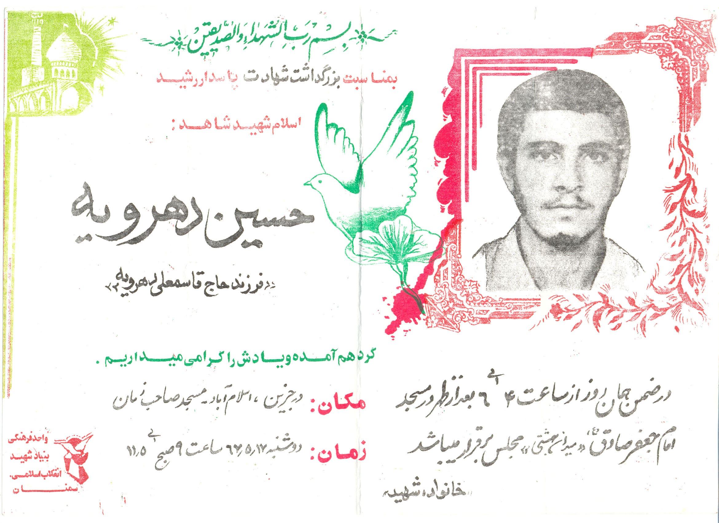 جواب ) بسم الله الرحمن الرحيم، اللهم اجعل محياي محيا محمد و آل محمد و مماتي ممات محمد و آل محمد، اينجانب حسين دهرويه، به تاريخ تولد 1346، شماره شناسنامه 851 و در خانواده اي كه الحمدلله مذهبي بوده متولد شده ام و با يادگيري قرآن و احكام اسلامي آشنايي پيدا كردم.