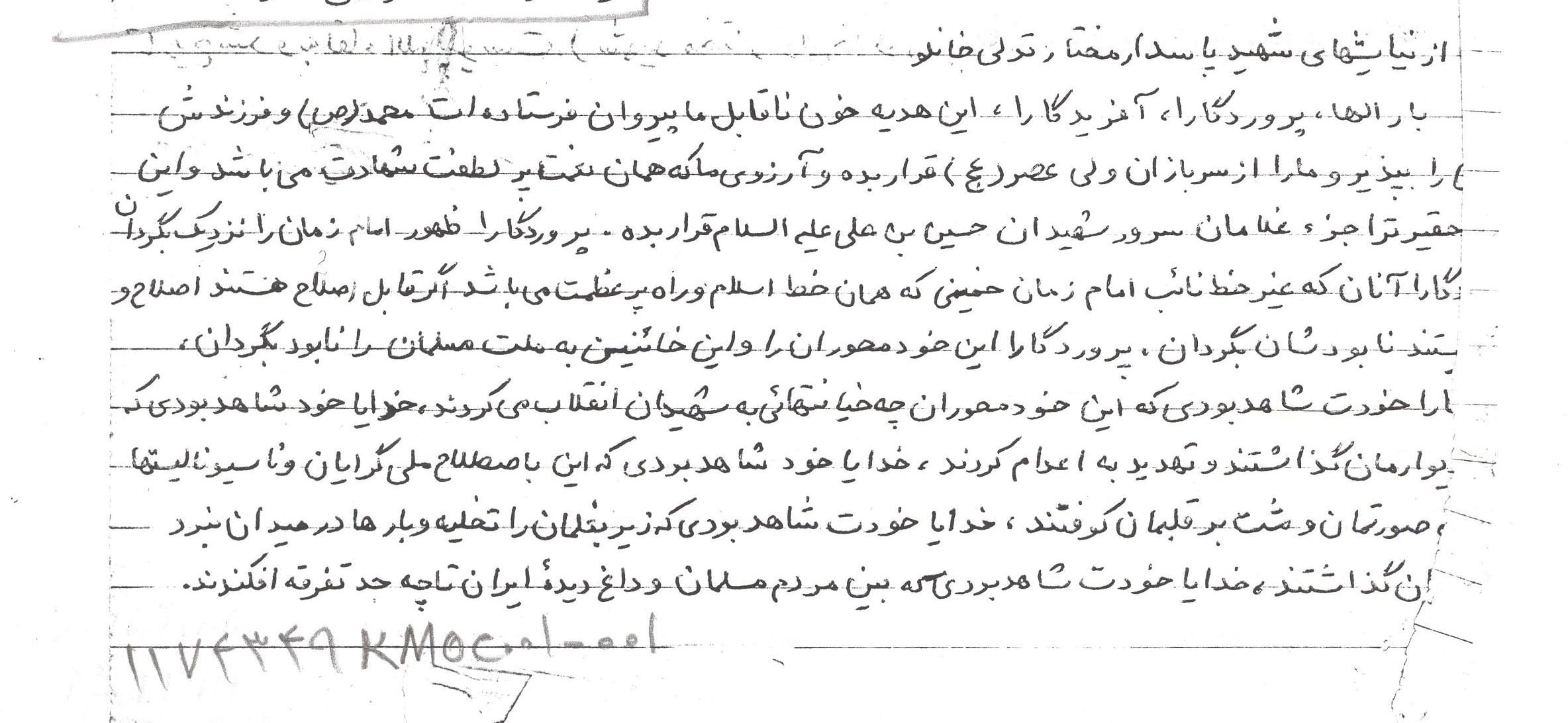 پروردگارا ظهور امام زمان را نزدیک بگردان پروردگارا آنان که غیر خط نائب امام زمان خمینی که همان خط اسلام و راه پرعظمت میباشد اگر قابل اصلاح هستند و اصلاح و ؟ نابودشان بگردان. پروردگارا این خود محوران را و این خائنین به ملت مسلمان را نبود بگردان.