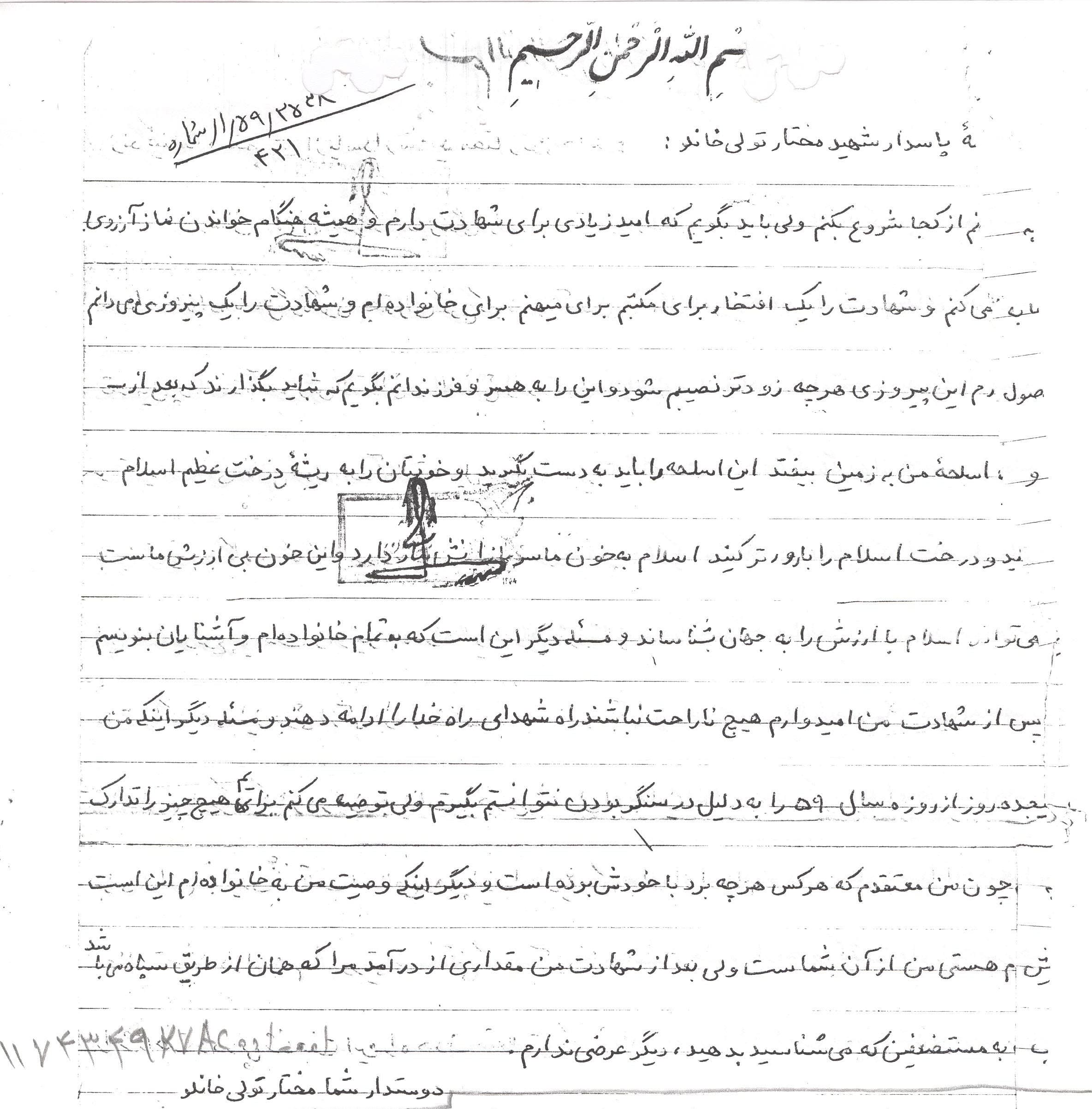 نمیدانم از کجا شروع کنم ولی باید بگویم که امید زیادی برای شهادت دارم و همیشه هنگام خواندن نماز آرزوی شهادت میکنم و آن را یک افتخار برای مکتبم برای میهنم برای خانواده ام و شهادت را یک پیروزی میدانم. آروز دارم این پیروزی زودتر نصیبم شود و این را به همسر و فرزندانم بگویم که نباید بگذارند که بعد از من اسلحه من به زمین بیفتد این اسلحه را باید به دست بگیرید و خونتان را به ریشه درخت عظیم اسلام بریزید و درخت اسلام را بارور کنید.