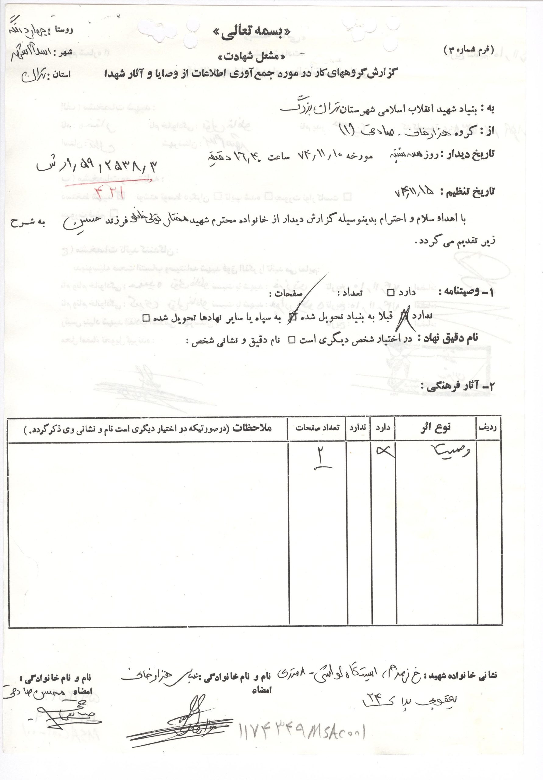 اسلام به خون ما سربازانش نیاز دارد و این خون بی ارزش ماست که میتواند اسلام باارزش را به جهان بشناساند و مسئله دیگر این است که به تمام خانواده ام و آشنایان بنویسم پس از شهادت من امیدوارم هیچ ناراحت نباشند شهدای راه خدا را ادامه دهند و مسئله دیگر اینکه من هیجده روز از روزه سال 59 را به دلیل درسنگر بودن نتوانستم بگیرم ولی توصیه میکنم برایم هیچ چیز را تدارک نبینید چون من معتقدم که هر کس هرچه برد با خودش برده است و دیگر اینکه وصیت من به خانواده ام این است که تمام هستی من از آن شماست ولی بعد از شهادت من مقداری از درآمد مرا که همان از طریق سپاه میباشد به مستضعفین که میشناسید بدهید. دیگر عرضی ندارم.