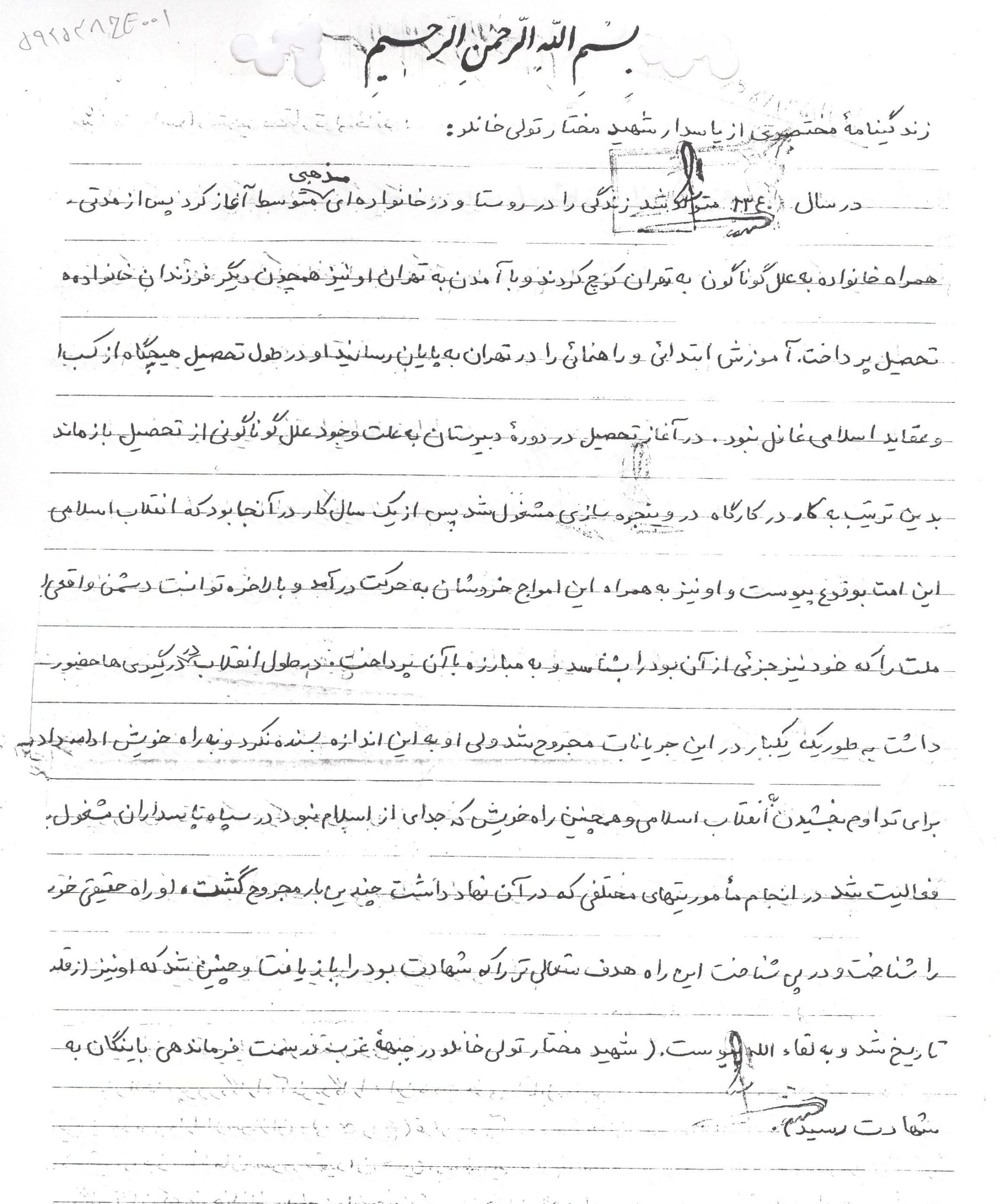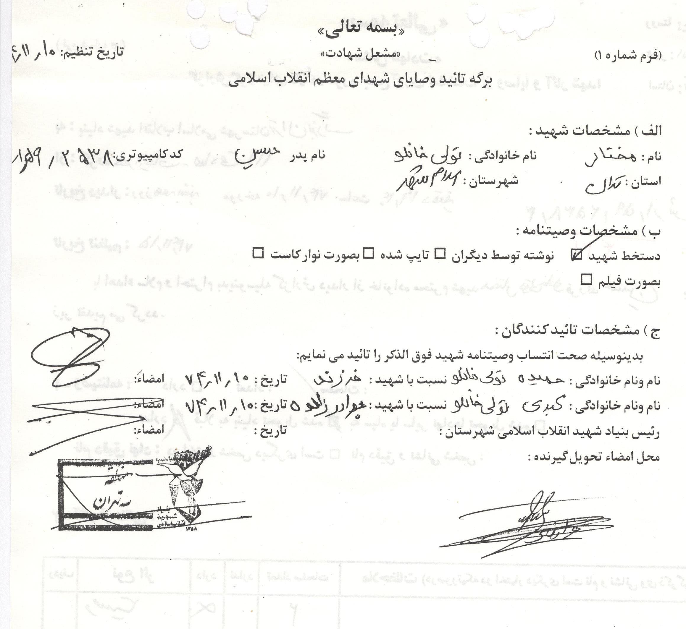 وصیتنامه پاسدار شهید مختار تولی خانلو: