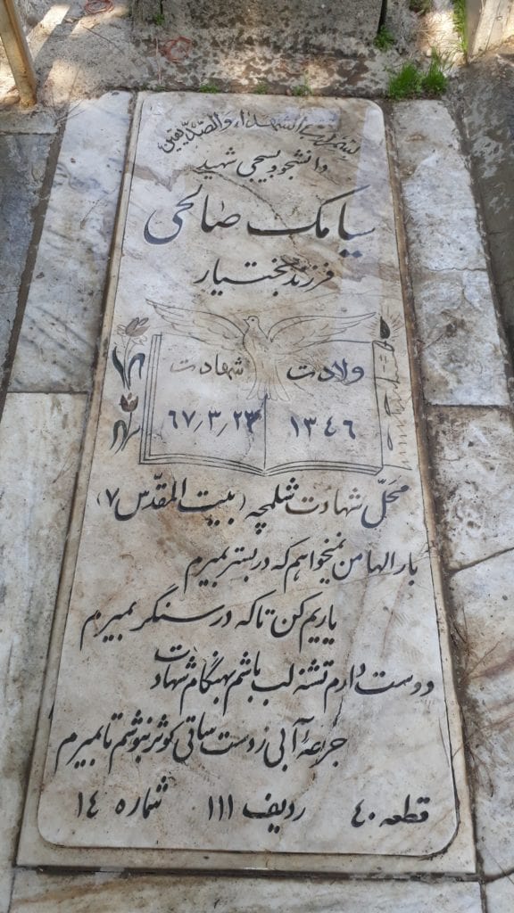 6) آقاي جليل باقر پيري مي گویند: من با سيامك صالحي صيغه برادري خوانده بوديم. چي بگم يك بچه محجوب بود از خانواده اي كه … اين بچه حقيقتا حجاب خاصي داشت هر كاري در مسجد انجام مي داد هر كاري كه بچه هاي ديگر شانه خالی می کردند او مشتاقانه انجام ميداد يك بار اعتراضي از او در مورد كار و چگونگي انجام آن نديديم او هر كاري كه روي زمين بود انجام مي داد تا رسيد به اينكه مي خواست برود منطقه در حقيقت از اجتماع و خانواده در رفتند. خيلي خانواده را تحت فشار گذاشت و در نهايت جيم شدند و رفتند منطقه و آنها را برده بودند جبهه هاي غرب كشور و از آن منطقه نسبتاً خنك غرب آنها را ناگهان به جنوب انتقال دادند و پس از پذيرش قطعنامه عراق تا ايستگاه حسيني پيش آمده بود و وضعيت به شدت بحراني بود بچه ها منطقه را خوب نمي شناختند و سيامك از تشنگي شهيد شد وقتي جنازه اش را آوردند بدنش و دور قفسه سينه اش تماماً كبود شده بود و در جنازه اش آثار تير و تركش نداشت و واقعا آنها لايق شهادت بودند و خوشا به سعادتشان كه معشوق خودشان را در آغوش كشيدند و به لقاء يار شتافتند.